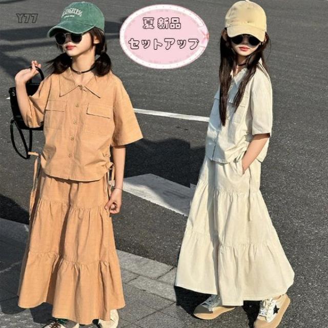韓国子供服 女の子 セットアップ キッズ 夏服 新品 スカートセット 女の子 半袖シャツ+スカート 2点セット レジャー ガールズ 無地 カジュアル シャツ ロング丈 スカート イベント 誕生日 結婚式 海外旅行 リゾート 上下セット かわいい 120 130 140 150 160 170