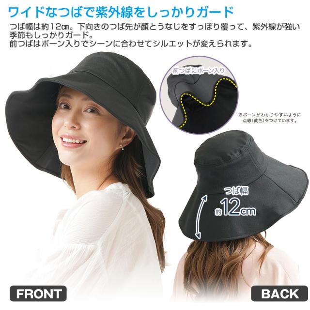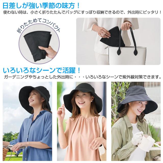 大きなつばでしっかりUV対策!UVカット率99%・UPF50+!Q-MAX0.23以上!折りたためてバッグに入れていつでもどこでもさっと日焼け対策♪ワイドなつばで紫外線をしっかりガード。つば幅は約12cm。下向きのつば先が顔とうなじをすっぽり覆って、紫外線が強い季節もしっかりガード。前つばはボーン入りでシーンに合わせてシルエットが変えられます。UVカット率99%・UPF50+。安心のUVカット率で普段使いしやすい「UV&クール折りたためる日よけ帽子」は丸顔、面長問わず誰でも似合うつば広タイプ。また、頭部内側は通気性のよいメッシュ素材を使用でムレにくい!接触冷感にすぐれた冷感生地で快適!裏縁はQ-MAX0.23以上の冷感生地を使用で涼やかな被り心地。日差しが強い季節の味方!使わない時は、小さく折りたたんでバッグにすっぽり収納できるので、外出時にピッタリ!いろいろなシーンで活躍!ガーデニングやちょっとした外出時に・・・「UV&クール折りたためる日よけ帽子」があればいろいろなシーンで紫外線対策できます。手洗いOK!汚れても手洗いできるので、いつでも清潔に保てます。