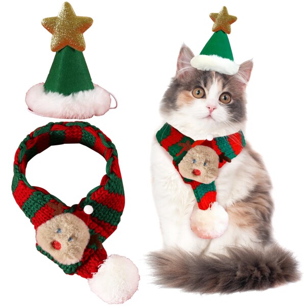 CANPLUS 2点セット クリスマス 犬 猫 帽子 マフラー 猫の服 犬服 小型犬 防寒 保温 サンタ 秋冬服 可愛い ペット用品 仮装 コスチューム プレゼント ギフト (グリーン, M)