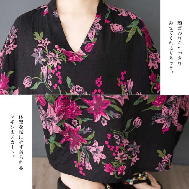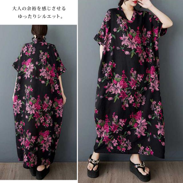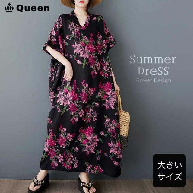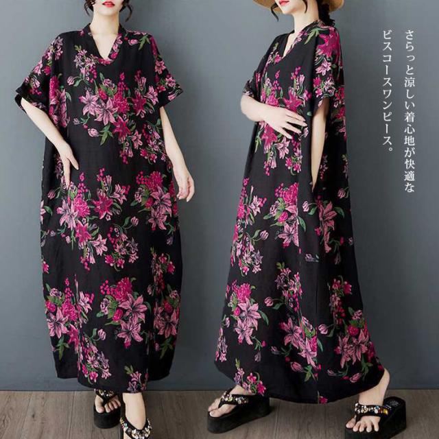 ★☆ワンピース 大きいサイズ レディース 花柄 半袖 Vネック ゆったり コットンタッチ ロング丈 体型カバー ぽっちゃり 夏 リゾート カジュアル☆★