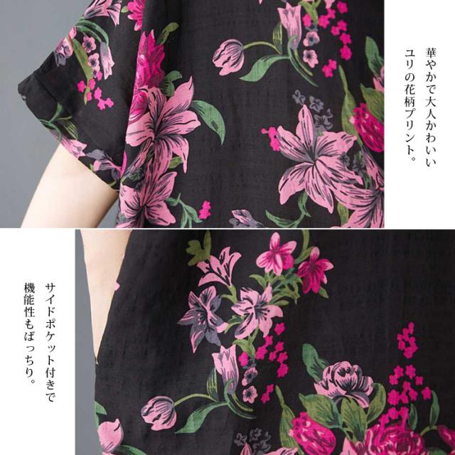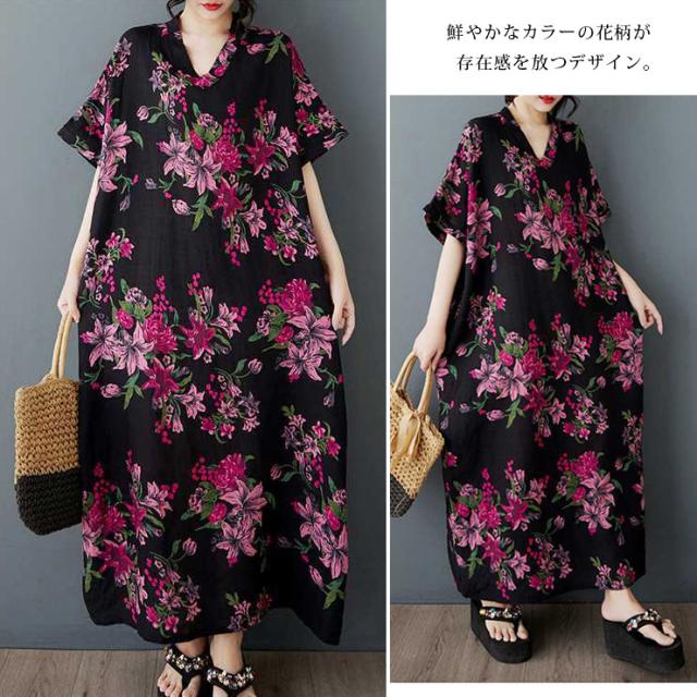 ワンピース 大きいサイズ 花柄 半袖 Vネック 夏 ゆったり (609982)