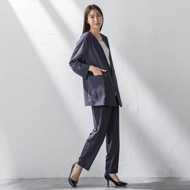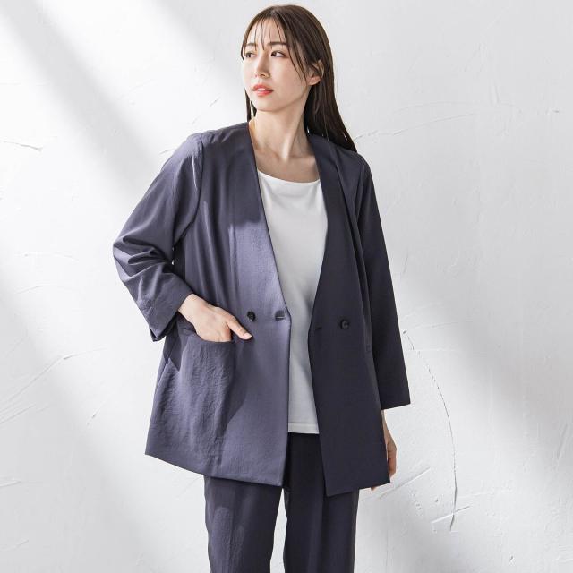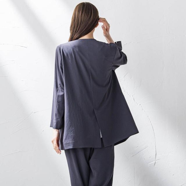 カーディガン感覚でサラッと羽織っていただけるノーカラージャケット。