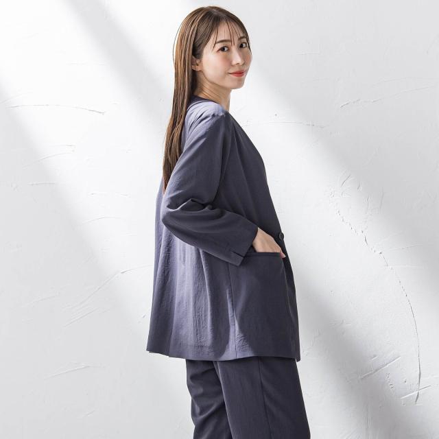 カーディガン感覚でサラッと羽織っていただけるノーカラージャケット。
