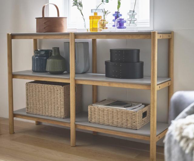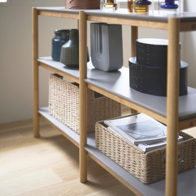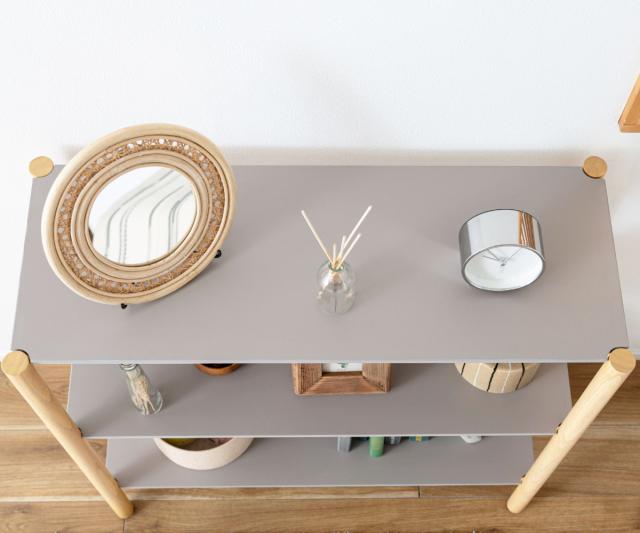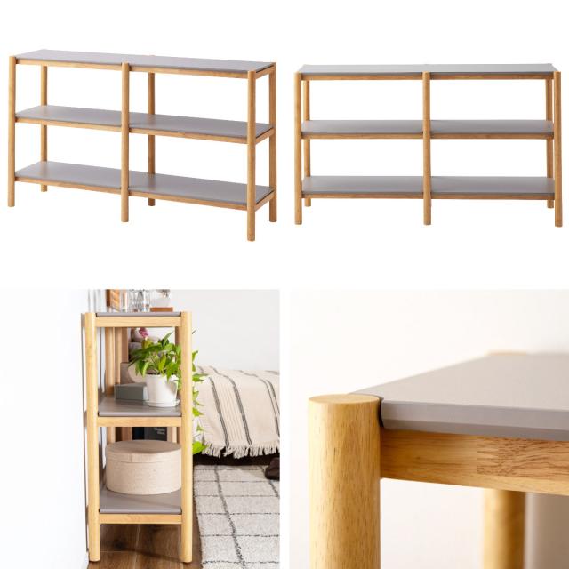 絶妙なくすみグレーの棚板と、木のぬくもりを感じさせるナチュラルなフレームを組み合わせたオープンシェルフです。スタイリッシュなグレーと、明るく優しいナチュラルカラーのコントラストがお部屋のアクセントになります。
