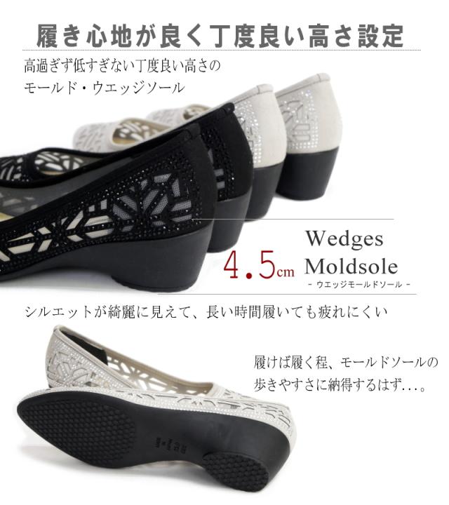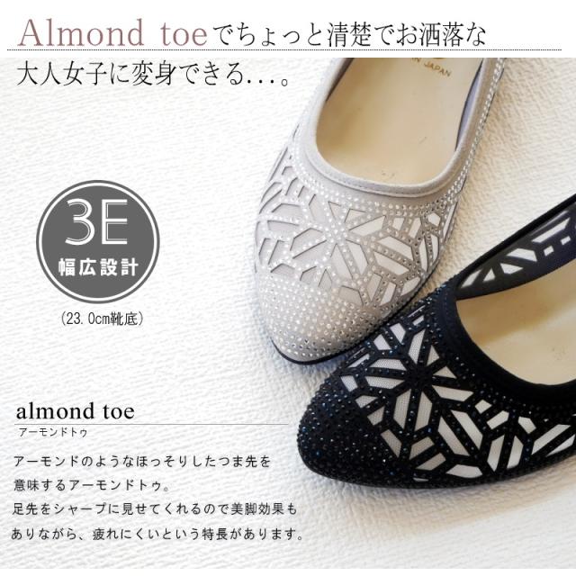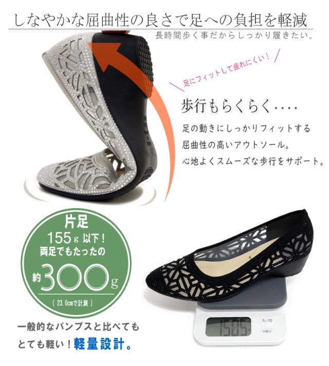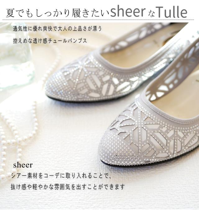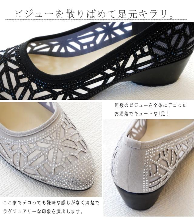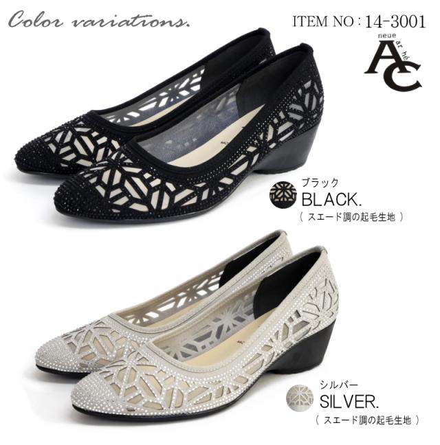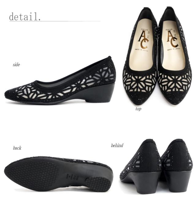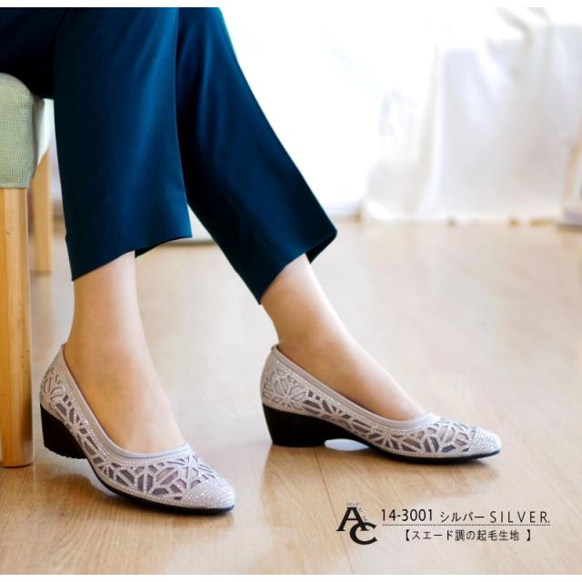 AC アミュエルコンセプト パンプス 日本製 シアー素材 チュール ラインストーン ビジュー カットワーク アーモンドトゥ ウエッジ 軽い 美脚 結婚式 卒入学 同窓会 仕事 屈曲 3e 春 夏