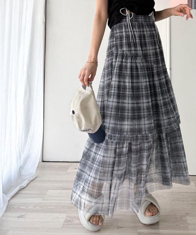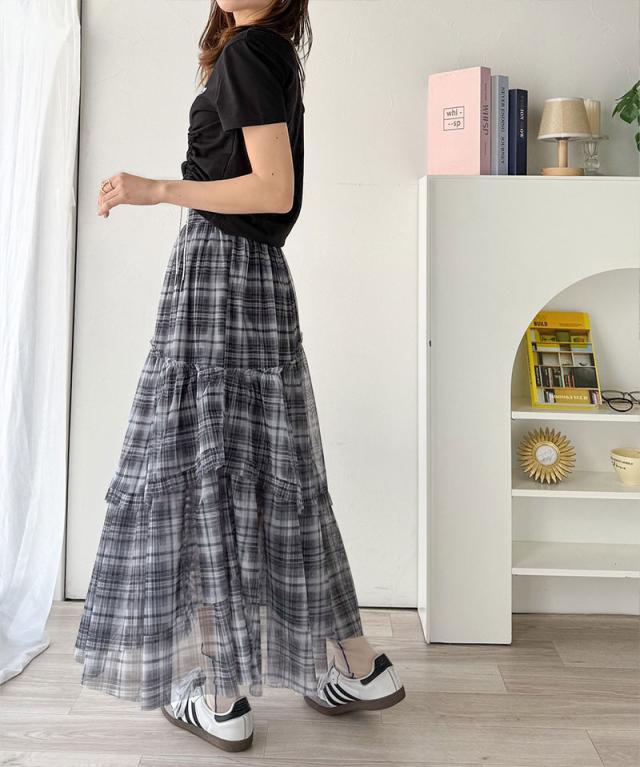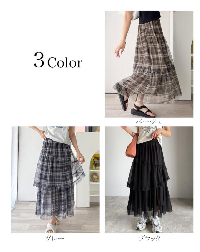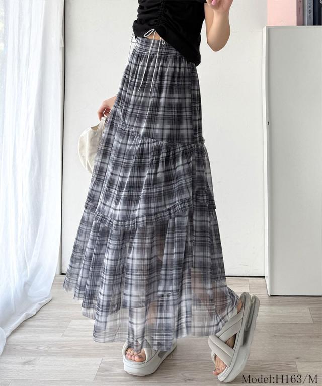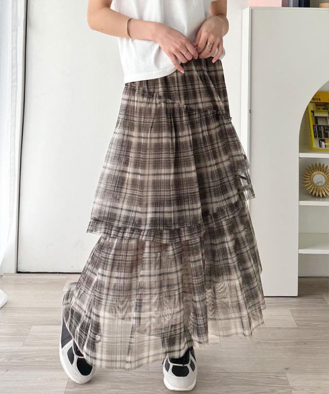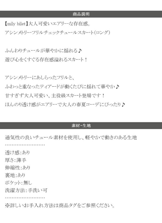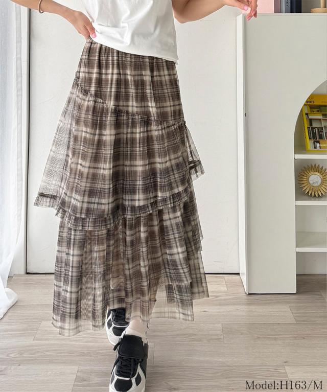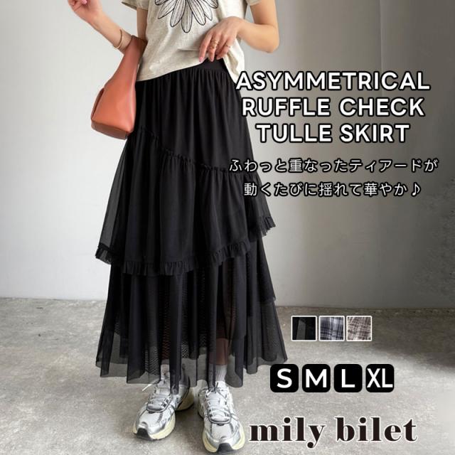 クラシカルエルフ秋新作 mily bilet ボトムス スカート レディース アシンメトリー フリル チェック チュール スカート ロング丈 ウエストゴム仕様 ゆるっと オーバーサイズ スタイルアップ 大きいサイズ 2025ss mi1139085
