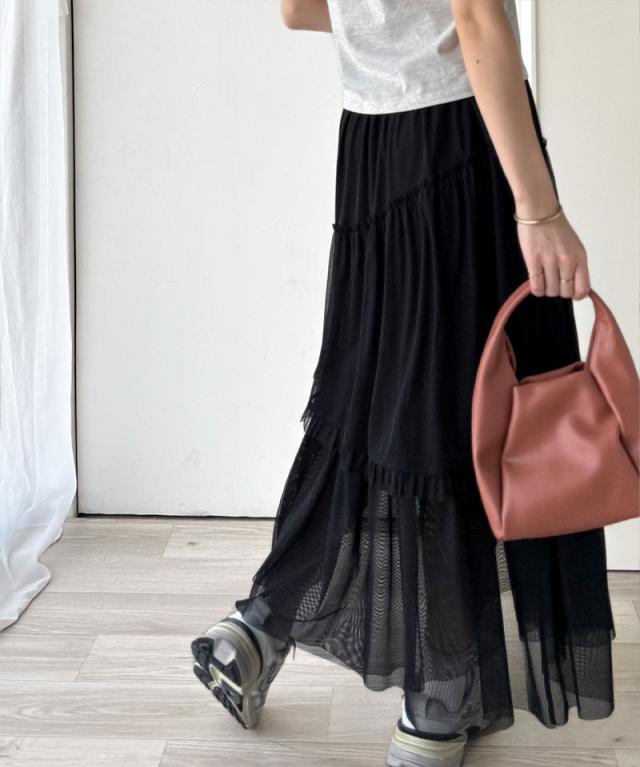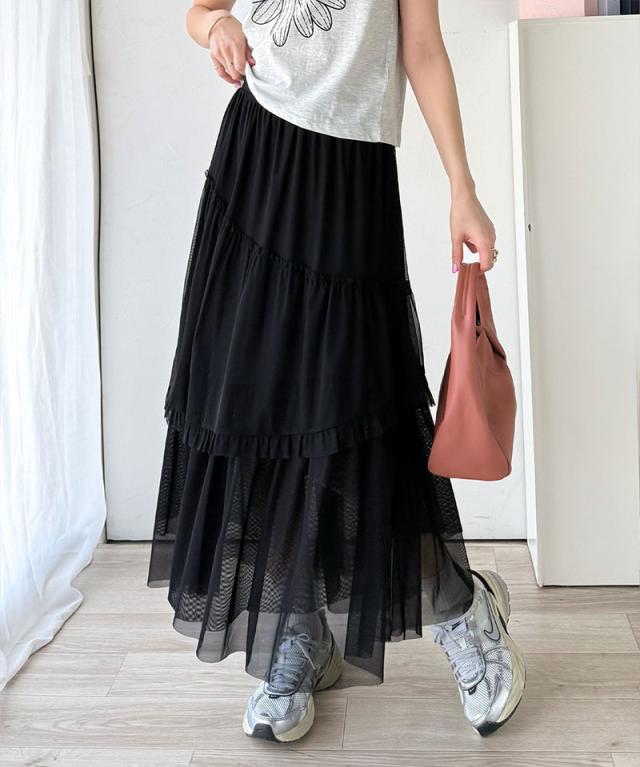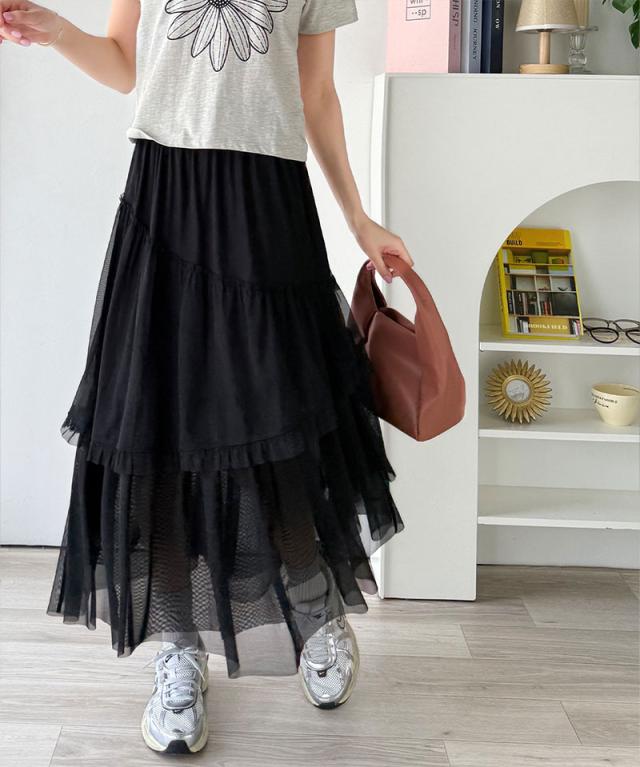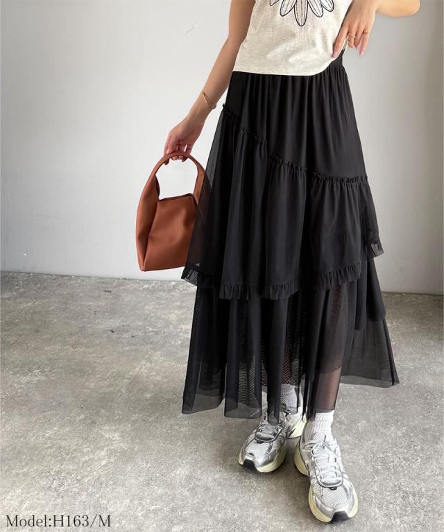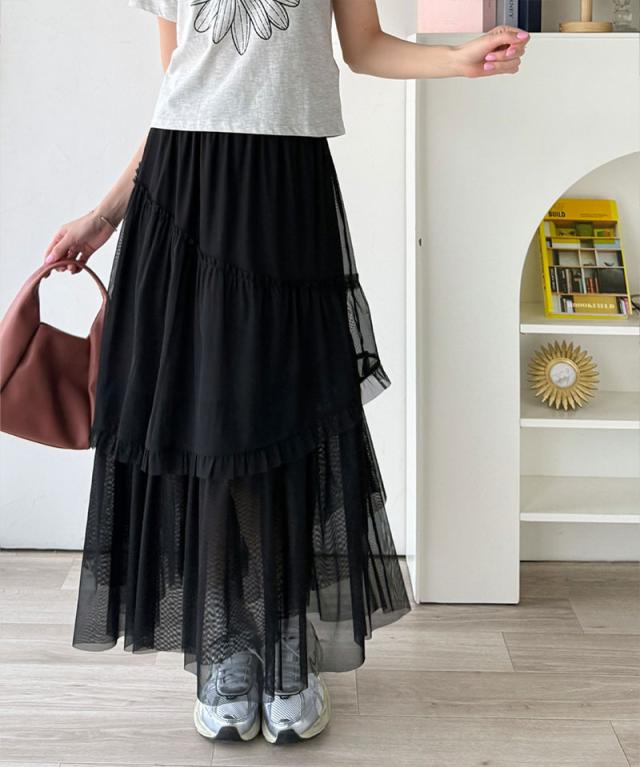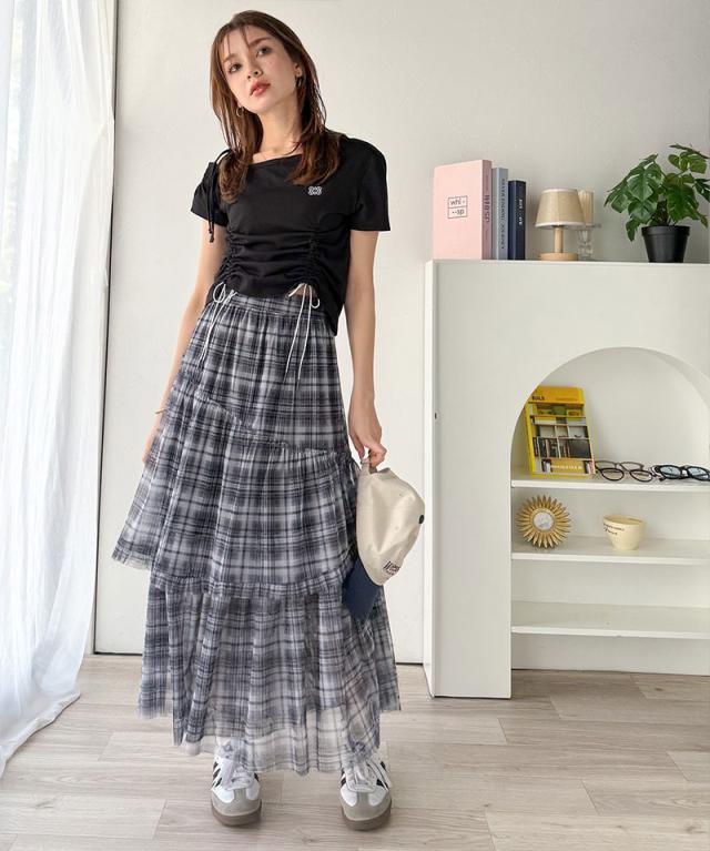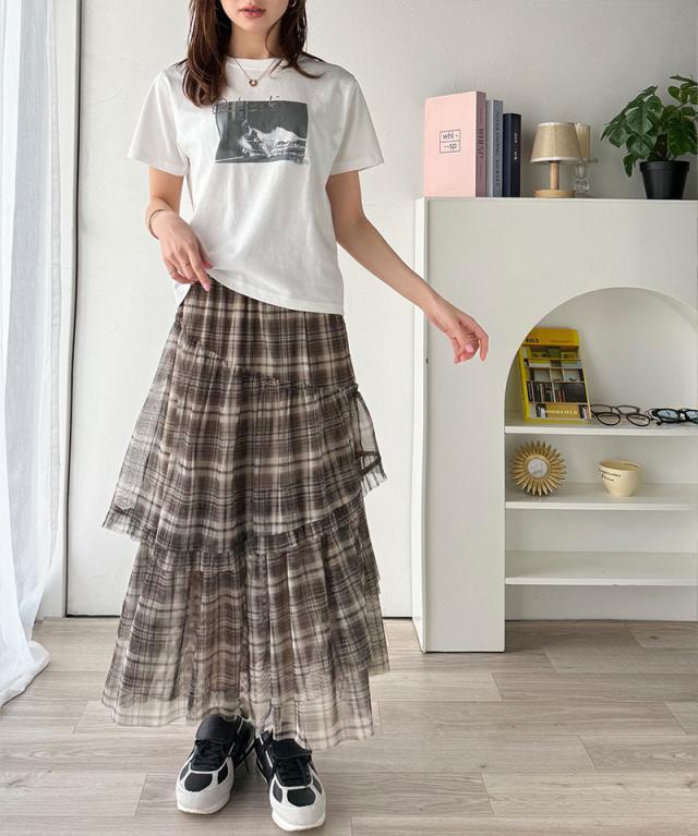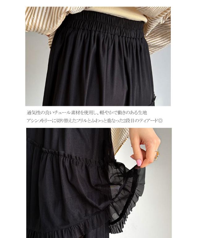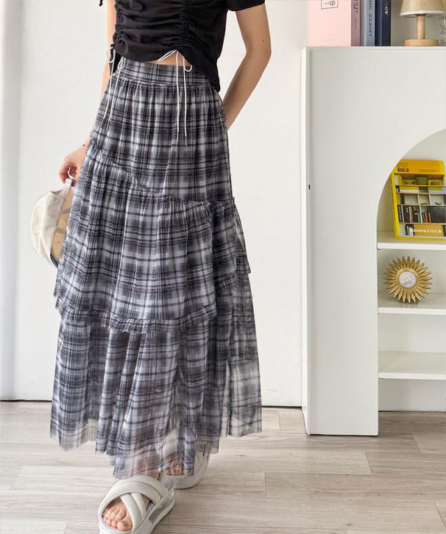 クラシカルエルフ秋新作 mily bilet ボトムス スカート レディース アシンメトリー フリル チェック チュール スカート ロング丈 ウエストゴム仕様 ゆるっと オーバーサイズ スタイルアップ 大きいサイズ 2025ss mi1139085