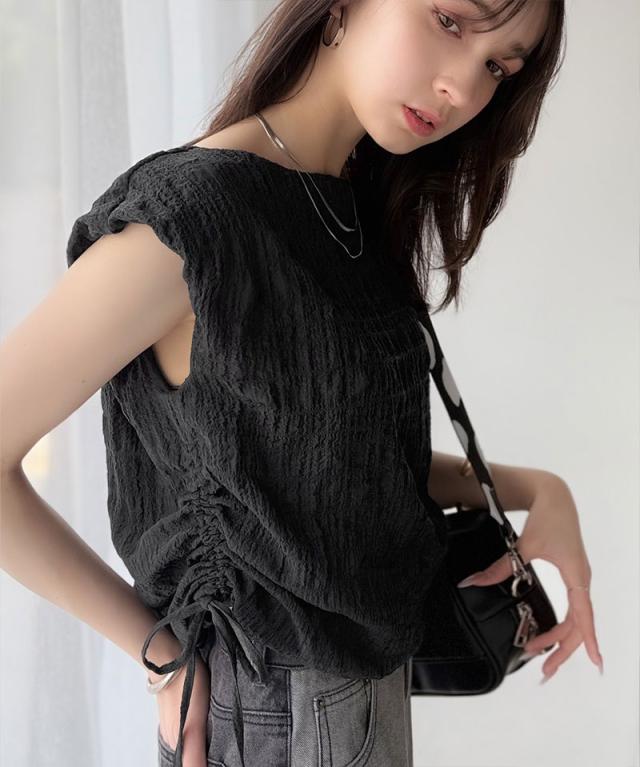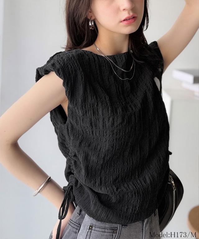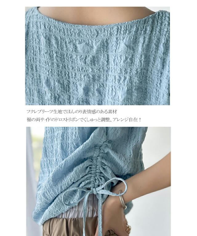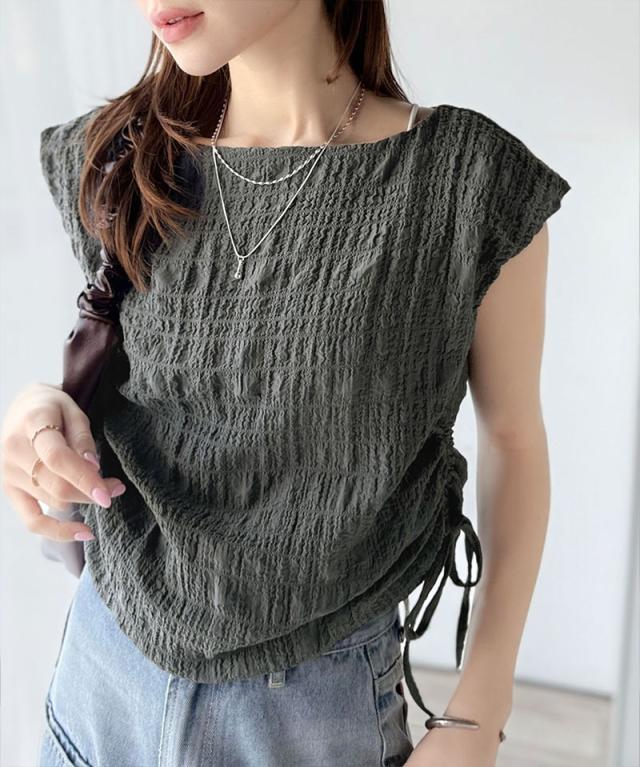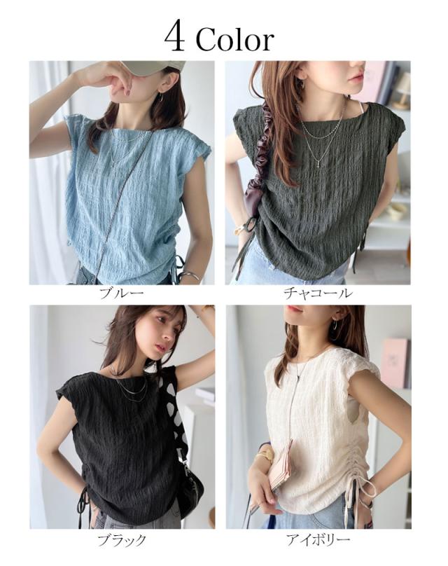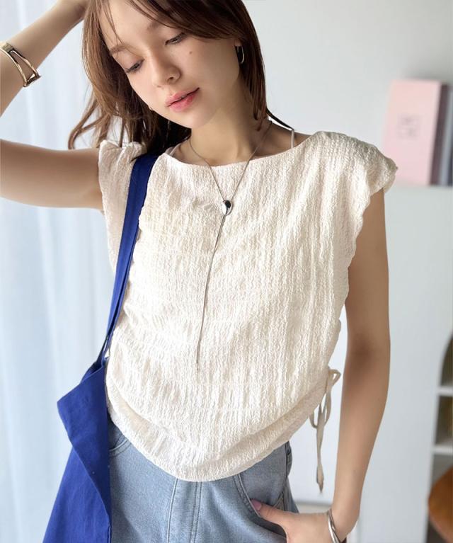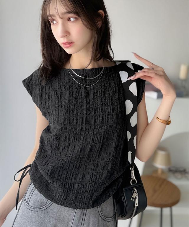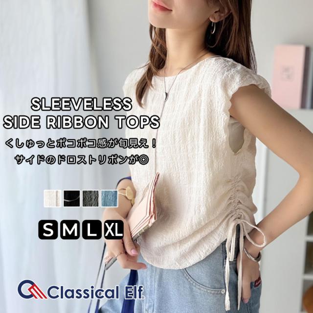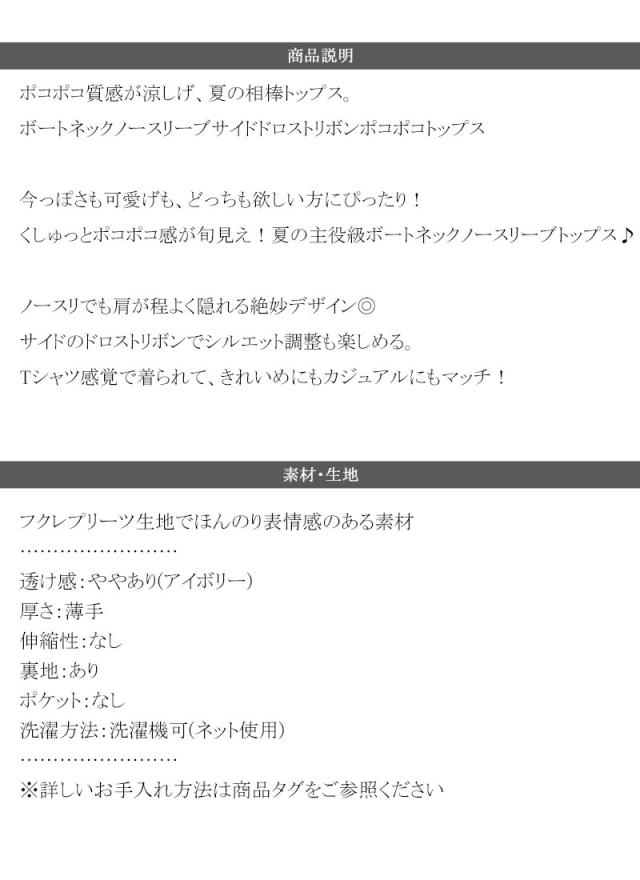 クラシカルエルフ秋新作 トップス Tシャツ レディース ポコポコ質感 ボートネック ノースリーブ サイドドロスト リボン シャーリング 着回し レイヤードコーデ ロングシーズン 華奢見せ 大きいサイズ 2025ss ce1070164