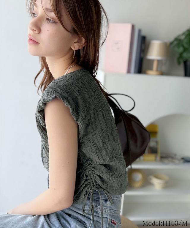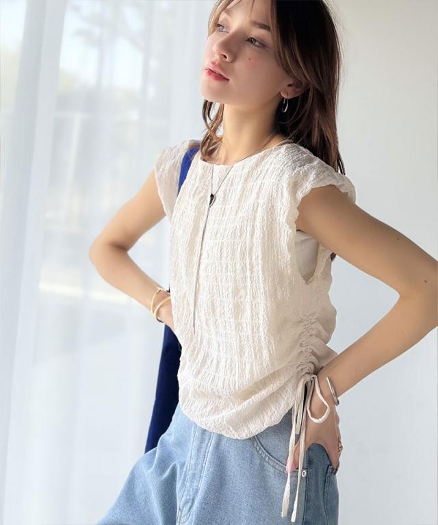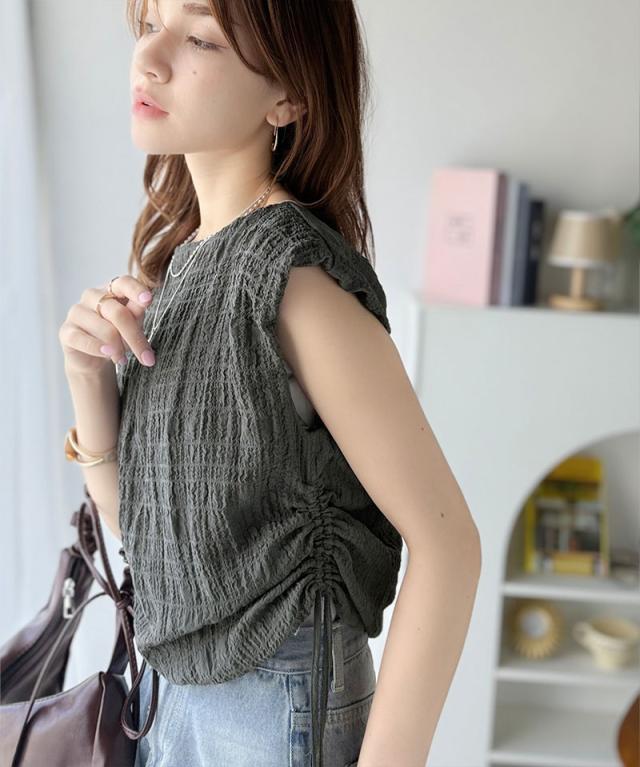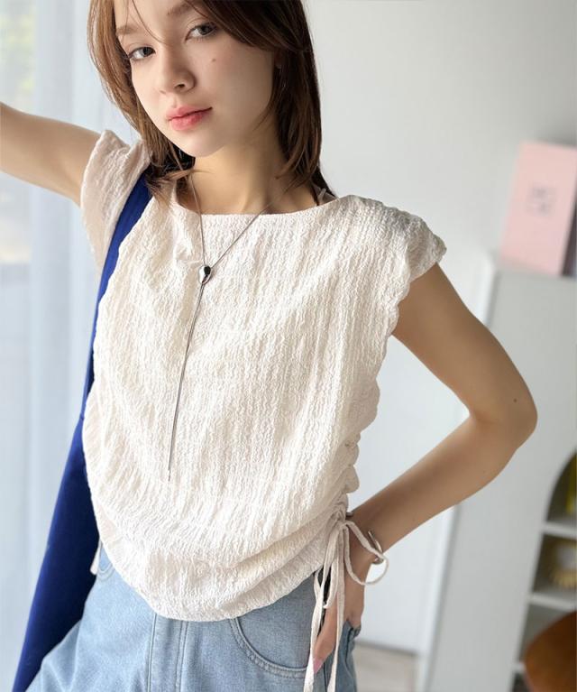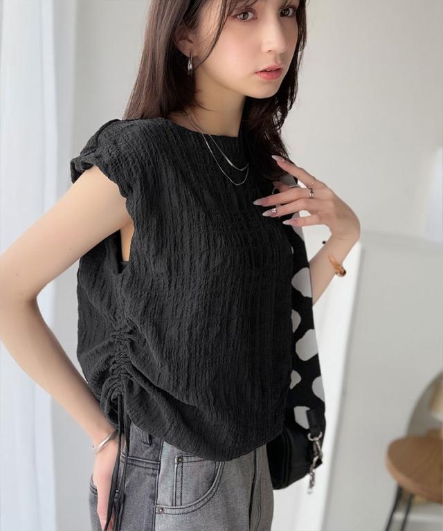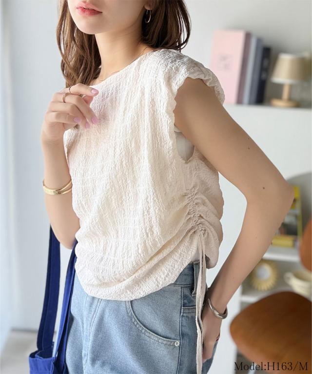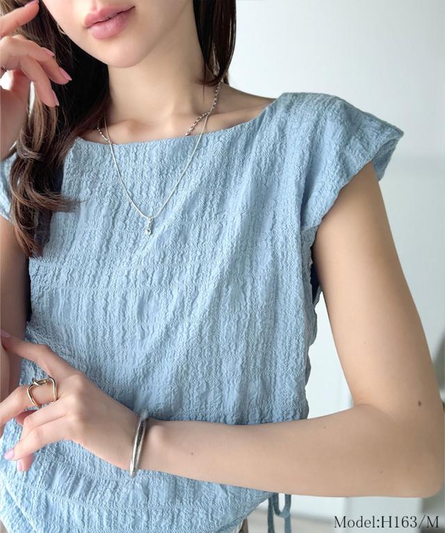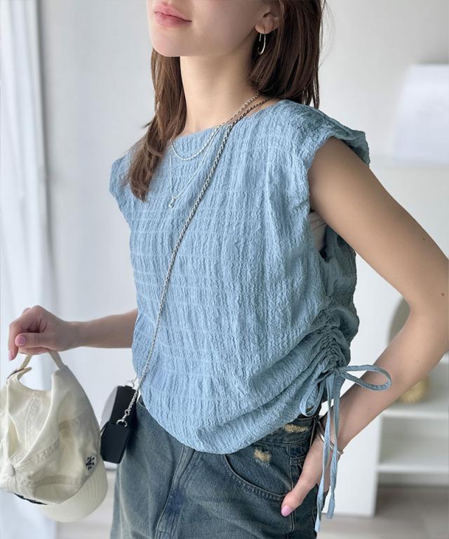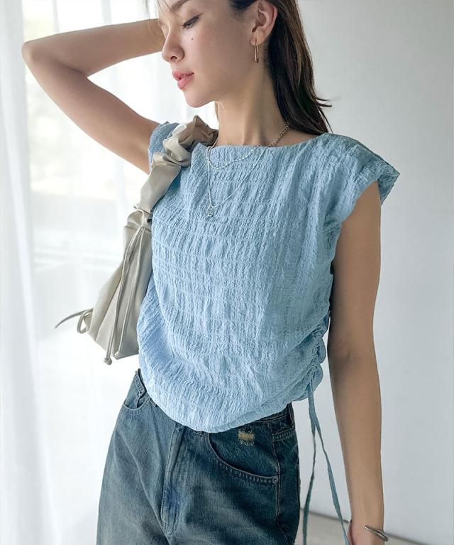 クラシカルエルフ秋新作 トップス Tシャツ レディース ポコポコ質感 ボートネック ノースリーブ サイドドロスト リボン シャーリング 着回し レイヤードコーデ ロングシーズン 華奢見せ 大きいサイズ 2025ss ce1070164