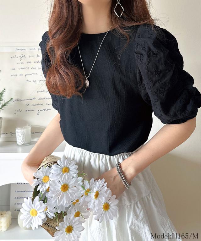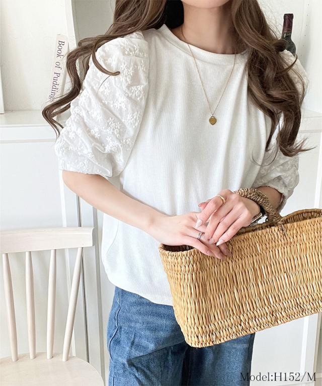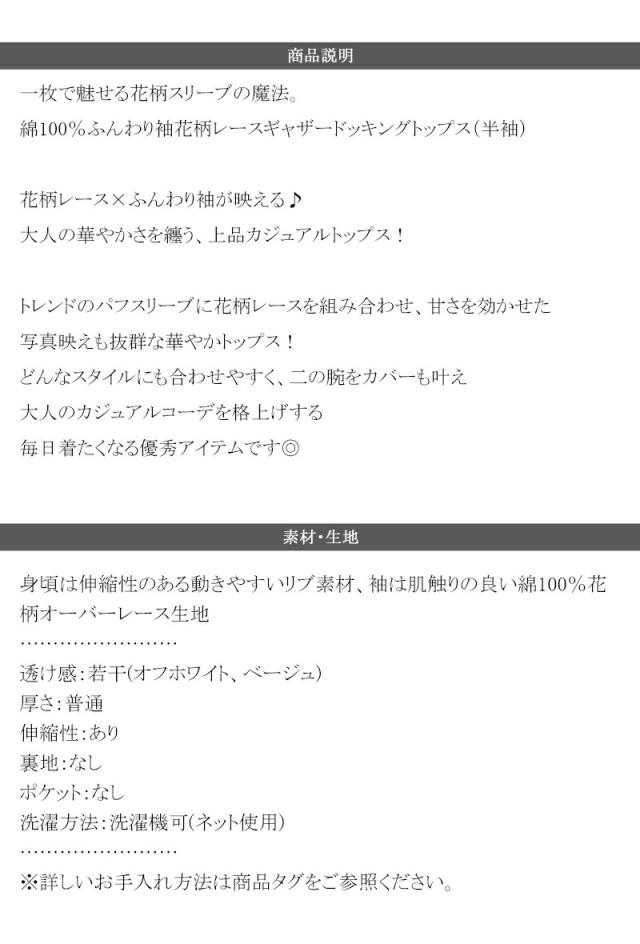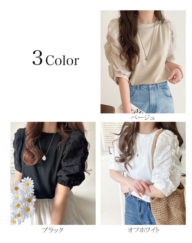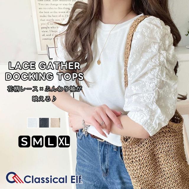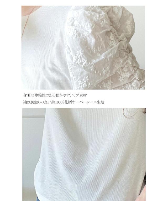 クラシカルエルフ秋新作 トップス Tシャツ レディース 綿100% ふんわり 袖 花柄 オーバー レース ギャザー ドッキング 半袖 パフスリーブ 二の腕カバー 大きいサイズ 2025ss ce1010435