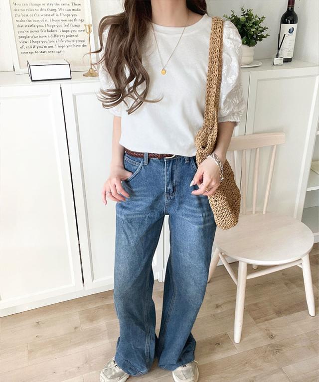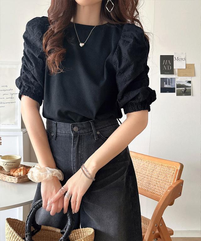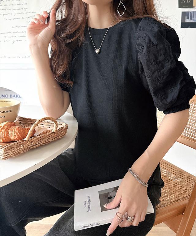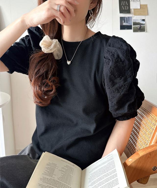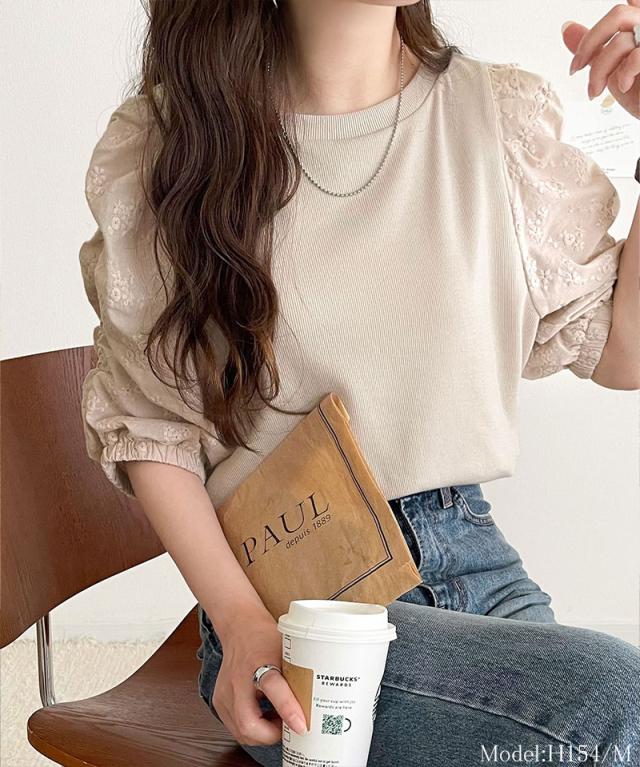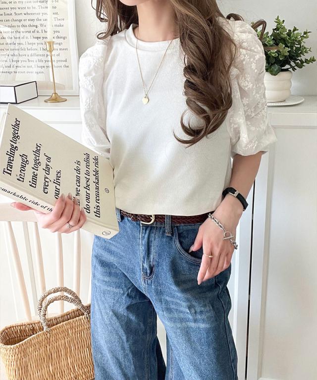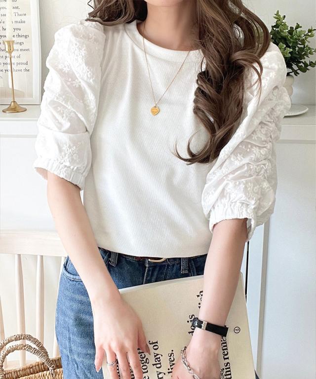 クラシカルエルフ秋新作 トップス Tシャツ レディース 綿100% ふんわり 袖 花柄 オーバー レース ギャザー ドッキング 半袖 パフスリーブ 二の腕カバー 大きいサイズ 2025ss ce1010435