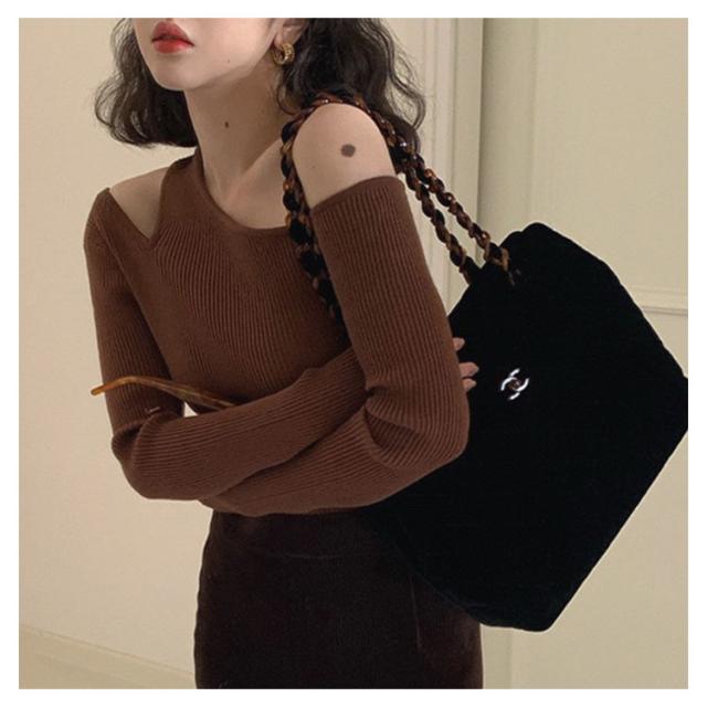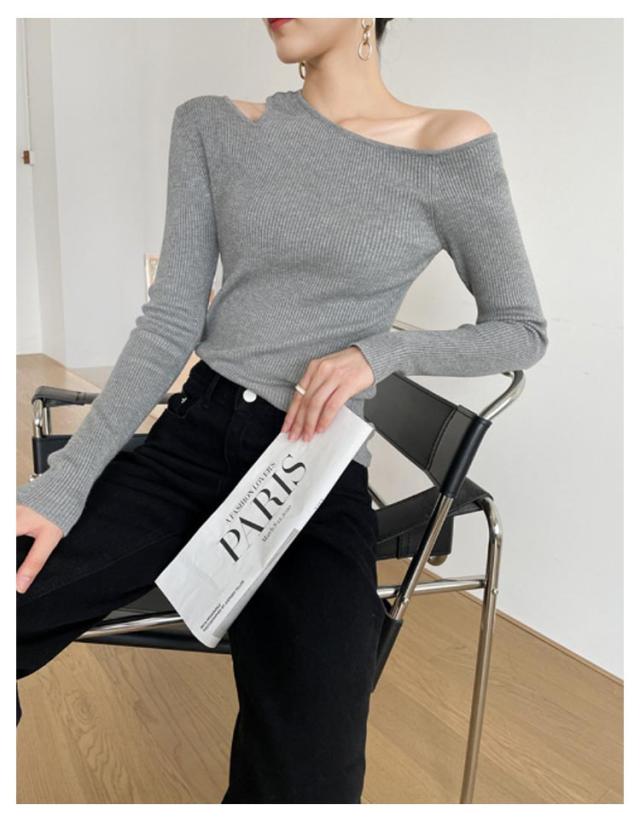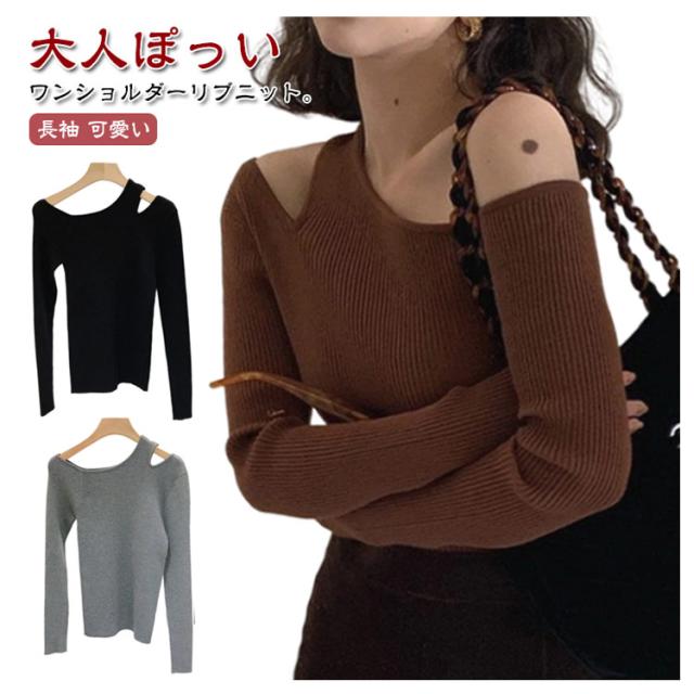 ワンショルダー トップス 長袖 ニットソー セーター ニットトップス ニットプルオーバー ニット 細見え オフショル 大人可愛い シンプル カジュアル フェミニン アシンメトリー 春 秋 ブラック ブラウン グレー