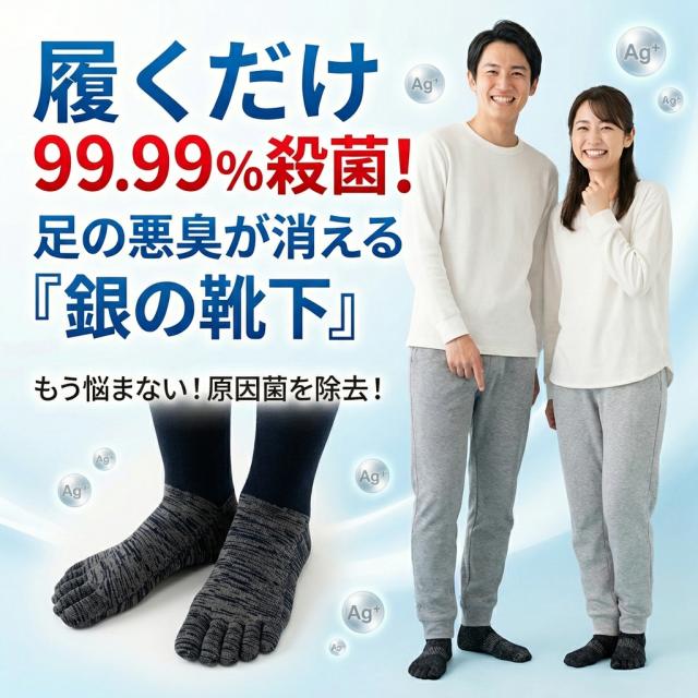 原因菌を99.9%抗菌殺菌: 銀イオン五本指靴下は、ニオイの原因菌を99.9%殺菌し、足を消臭、無臭にします。銀イオンは、黄色ブドウ球菌やイソ吉草酸、白癬菌など様々な菌に対して有効性が認められています。