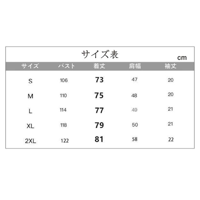 | サイズについての説明 | M バスト110cm、着丈75cm、肩幅48cm、袖丈20cm。 L バスト114cm、着丈77cm、肩幅49cm、袖丈21cm。 XL バスト118cm、着丈79cm、肩幅50cm、袖丈21cm。 2XL バスト122cm、着丈81cm、肩幅54cm、袖丈22cm。 3XL バスト126cm、着丈83cm、肩幅56cm、袖丈23cm。 ※サイズ表の実寸法は商品によって1-3cm程度の誤差がある場合がございます。 |