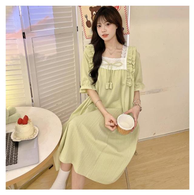 | お昼も可愛い洋服を着て、夜も可愛いパジャマです。 お肌に直接触れるものだからこそコットンの安心♪ すっきりとした薄手の生地は軽く、サラリとした肌触りが気持ちのいいです。 胸元のリボン、柔らかく繊細なレース、袖口もフリフリで美シルエット! 姫系デザインで、お部屋でもおしゃれで上品なルームワンピースです。 | |