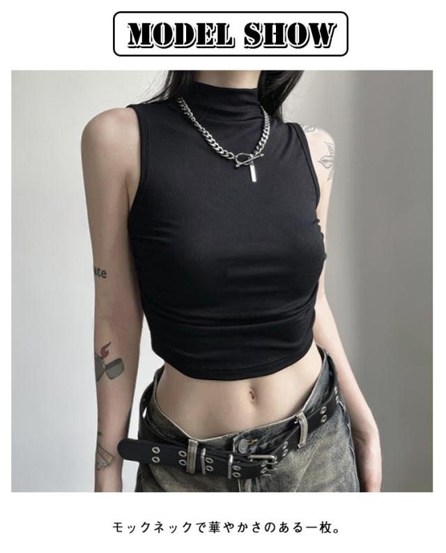 レディース タンクトップ へそ出し モックネック ショート丈 トップス ノースリーブ タンク 夏 ダンス衣装 重ね着風 ショートタンクトップ レイヤードタンクトップ 見せインナー 見せタンクトップ 着やせ へそ出し S M L XL