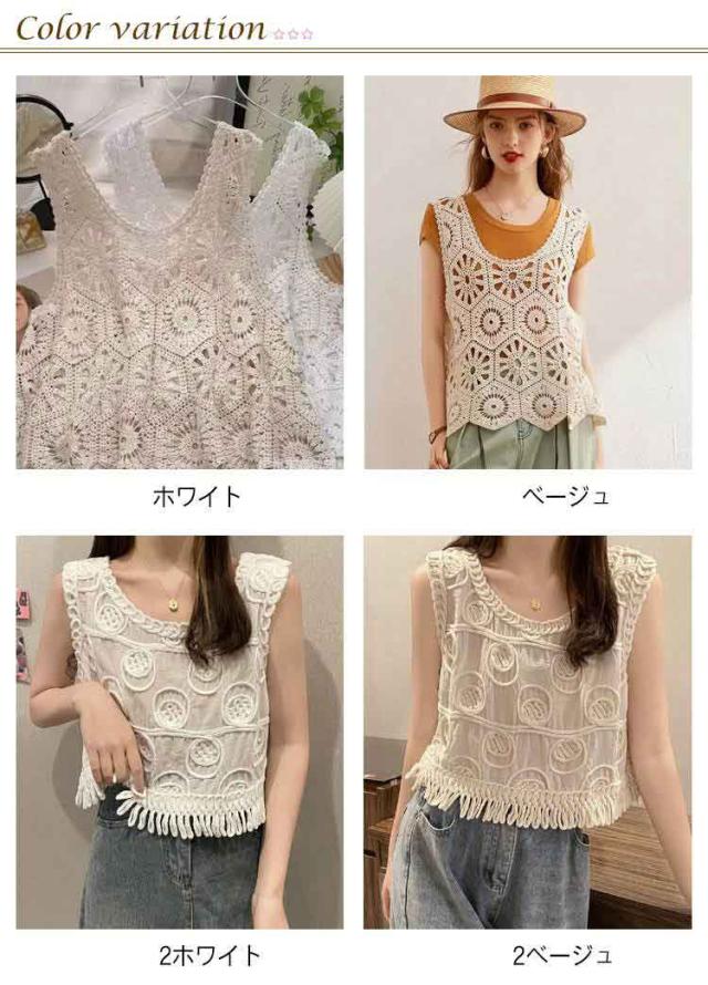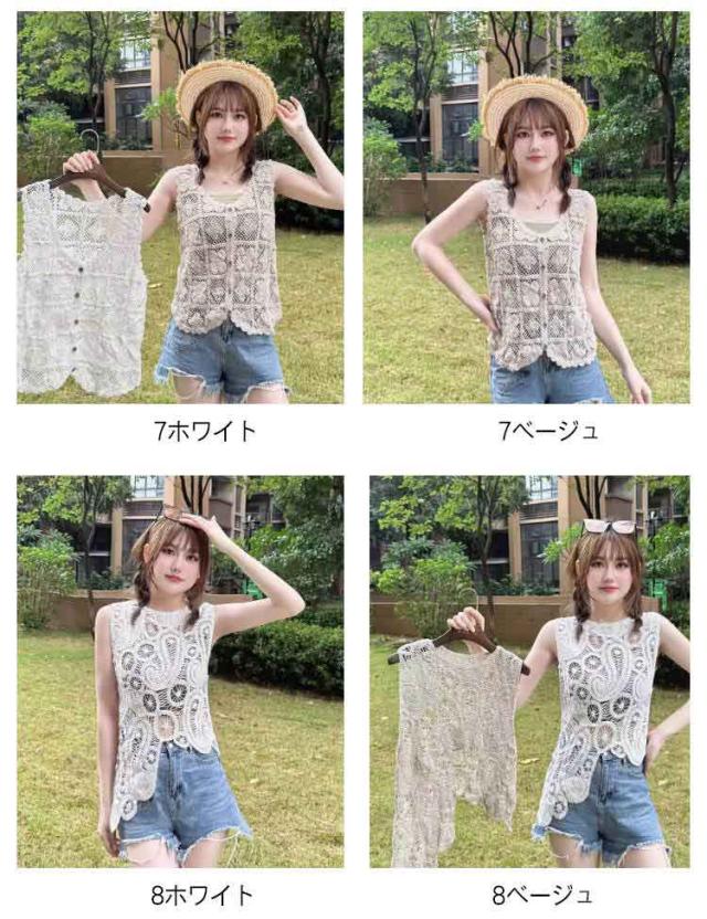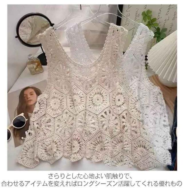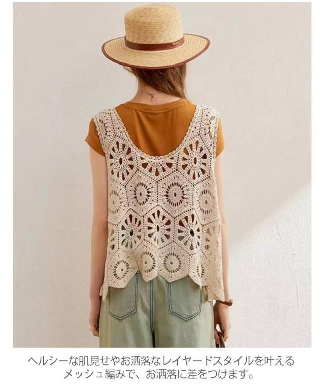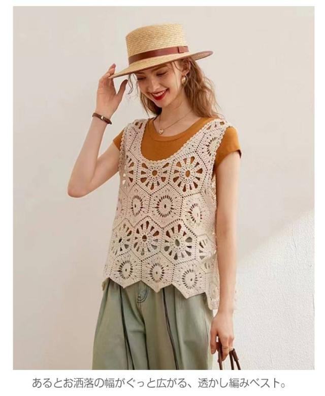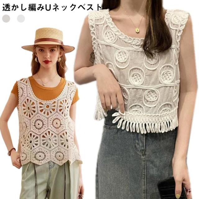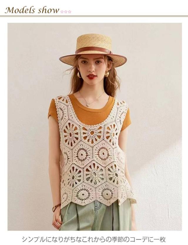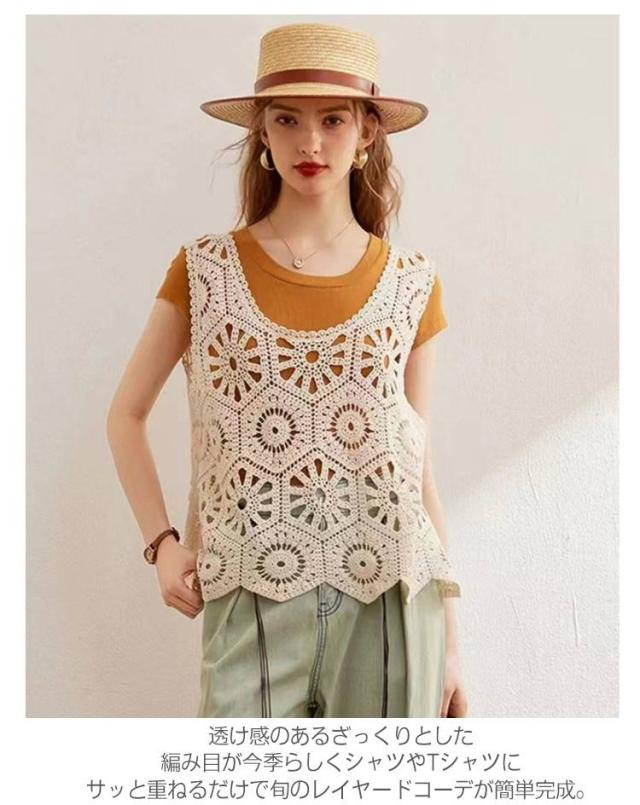 春 透かし編み ベスト トップス 夏 クロシェ編み ベスト プルオーバー Uネック トップス カジュアル 無地 レイヤード ニットベスト フェミニン きれいめ カジュアル かぎ編み 無地 大人かわいい 透け