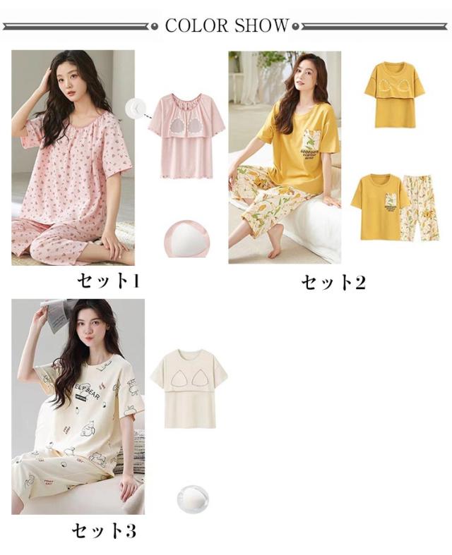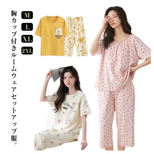 ルームウェア セットアップ パジャマ ナイトウェア 可愛い パジャマ ルームウェア レディース レディース おしゃれ カップ付き 寝巻き 半袖 ショートパンツ 7分丈パンツ 上下セット ルームウェア 寝間着 夏用 ゆったり 体型カバー 半袖 部屋着 セットアップ