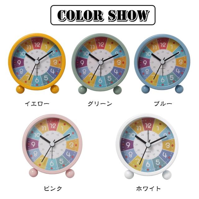 | かわいい虹色の知育目覚まし時計。【5色】 【子供向けの目覚まし時計情報】この目覚まし時計は小学生の男女向けの時計学習用知育目覚まし時計です。高級感あふれる金属塗装面は、マットな質感で指紋汚れなどが付きにくい材質を使用しています。ちょこんと丸い脚と個性的な数字、おしゃれな空洞のある針で、インテリア性も抜群です。 【カラー文字盤デザイン 知育目覚まし時計】カスタマイズの子供 知育 目覚まし時計には、カラー文字盤を採用し、豊富な色(色分けしたの時針・分針・秒針)が子供に時間を識別しやすくし、文字盤のカラー時間帯にひらがなをカスタマイズし、子供の時計学習をより円滑にすることができます。カラフルで子供の興味を誘います。 【静音&連続秒針の置き時計】この目覚まし時計は秒針のカチカチ音がない連続秒針を採用し、時計の計時をより正確にすると同時に、環境に静かさをもたらし、子供の枕元に置いても静かな知育時計です。 【ライト付の夜間見やすい時計】この子供 知育用目覚まし時計は蛍光(時針・分針)とライト機能があります。夜や暗い場所で時間を確認したい時にスイッチ(裏面)で簡単にライトが点灯し、時間の確認も楽にできます。 【時間管理用アラーム機能時計】この学習用アナログ時計はアラーム機能があります。アラーム設定がとても簡単です。子供が定時に起きる、学ぶ或いは遊びのより良い生活習慣を育てることができます。子供の時間管理に便利な学習時計です。 | |