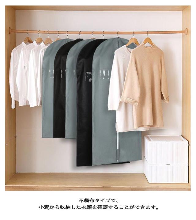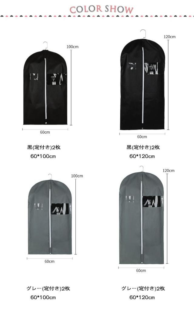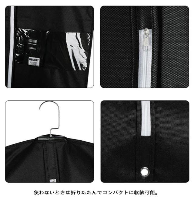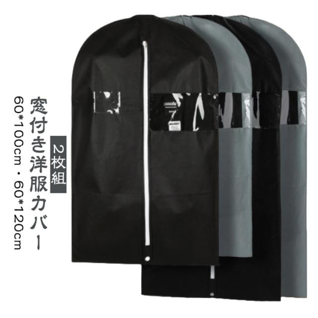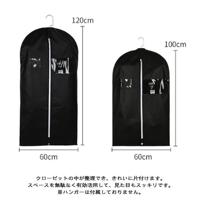 | 【窓付き洋服カバー】【2枚組】【60*100cm・60*120cm】 通気性の良い不織布で作られているため大切な洋服などをホコリ、カビ、虫、汚れや湿気からしっかり守って綺麗に収納出来ます。 不織布タイプで、小窓から収納した衣類を確認することができます。 ポケット付きなので、防虫剤などを入れることができます。 真ん中のファスナーを開けてサッと洋服を収納できます。 普通の洋服カバーと違い、裾の部分が閉じているため、床に落ちているほこりの侵入を防ぎます。 洋服カバーが汚れた場合、濡れた布で拭きすぐに綺麗になります。 使わないときは折りたたんでコンパクトに収納可能。 クローゼットの中が整理でき、きれいに片付けます。スペースを無駄なく有効活用して、見た目もスッキリです。 ※ハンガーは付属しておりません。 | |