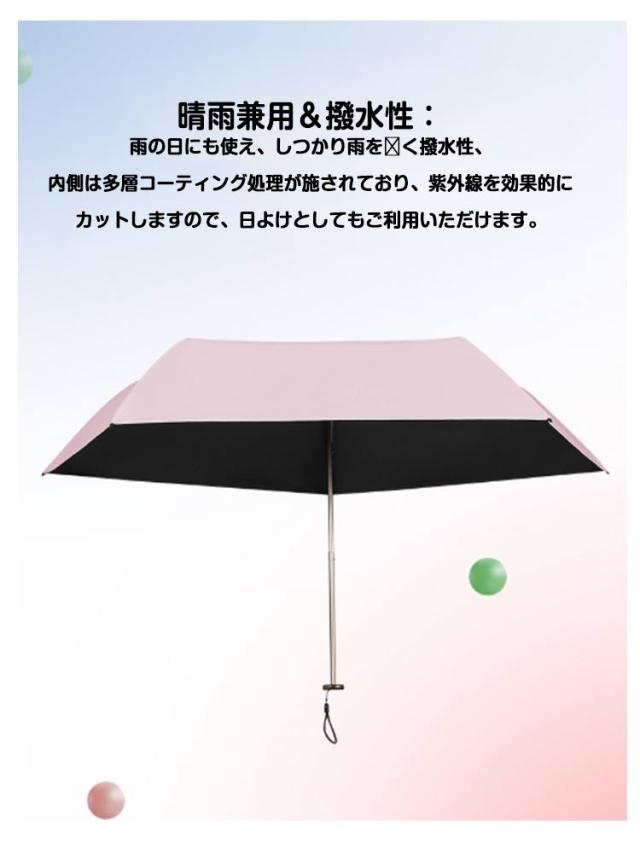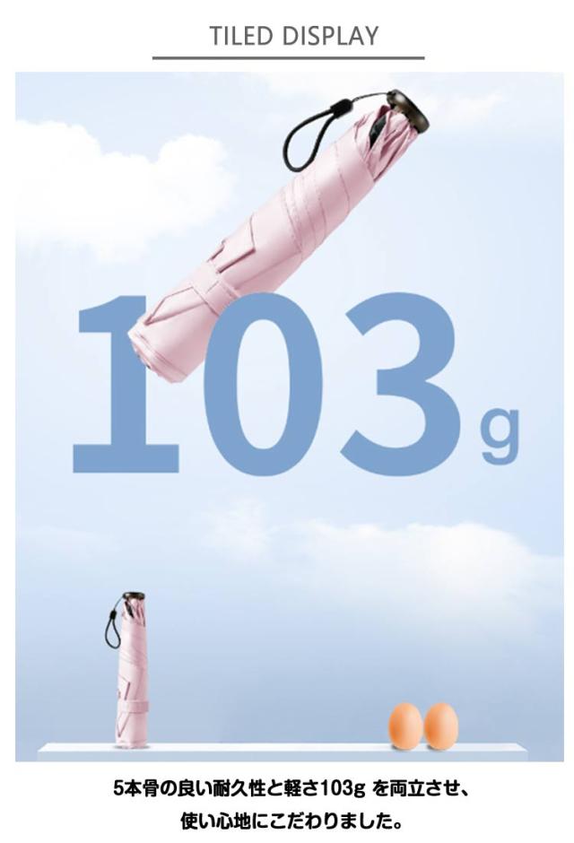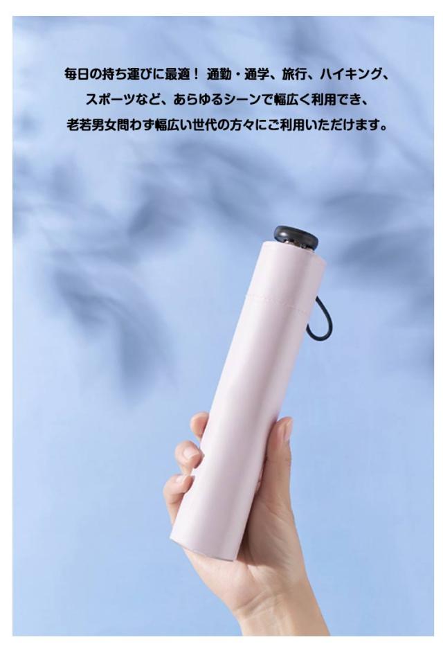 | UPF50+/完全遮光/103g軽量/晴雨兼用 遮熱塗装加工、遮熱効果-18°。 折りたたみ収納:20cm、バッグに収納できる。 晴雨兼用&撥水性:雨の日にも使え、しつかり雨を?く撥水性、内側は多層コーティング処理が施されており、紫外線を効果的にカットしますので、日よけとしてもご利用いただけます。 5本骨の良い耐久性と軽さ103g を両立させ、使い心地にこだわりました。 高密度傘生地と厚い黒ノリコーティングを採用して、UPF50+、UVカット率>99%、完全遮光、効果的に日焼け止めすることができます。 毎日の持ち運びに最適! 通勤・通学、旅行、ハイキング、スポーツなど、あらゆるシーンで幅広く利用でき、老若男女問わず幅広い世代の方々にご利用いただけます。 | |