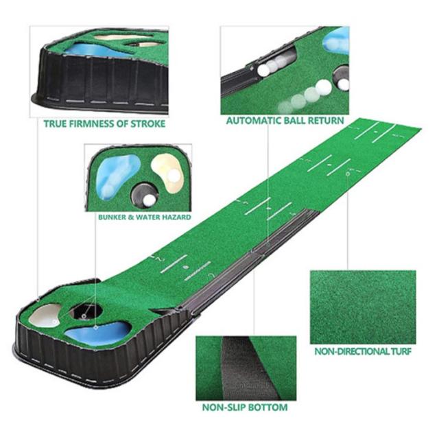 | 補助ライン&自動返球機能付きパターマット。 【自宅でスキルアップ】初心者の方でも人目を気にせず、寒い日でも、雨の日でも自宅で効果的な練習ができます。ぜひ練習を重ねて、スコアアップしてください。 【集中力・方向性の強化】補助ラインが付いているレーンで、ご自身のボールの転がり方の確認ができ一番技術的に難しいとされているまっすぐ回転させたボールを打つ感覚を何度でも確認しながら身につけます。感覚を身につけた後は、無地のラインで実際にコースに打つようにイメージしたライン通りに回転をかけて打つ練習を行うと良いでしょう。 【オートリターン機能】弊社のゴルフマットには自動返球機能を搭載しているので、カップインもしくは奥のガードまで行ったボールは傾斜を下り排出口から元来た方向へ転がって手元まで戻り、反復練習を効率よく行うことができます。 【滑り止め加工】裏面はフローリング等にキズの付きにくい柔軟性が高い軽量EVA素材を採用され、安定したプレイができます。収納サイズ:49*16*40.5 使わないときは、折りたたんで箱に収納します。 | |