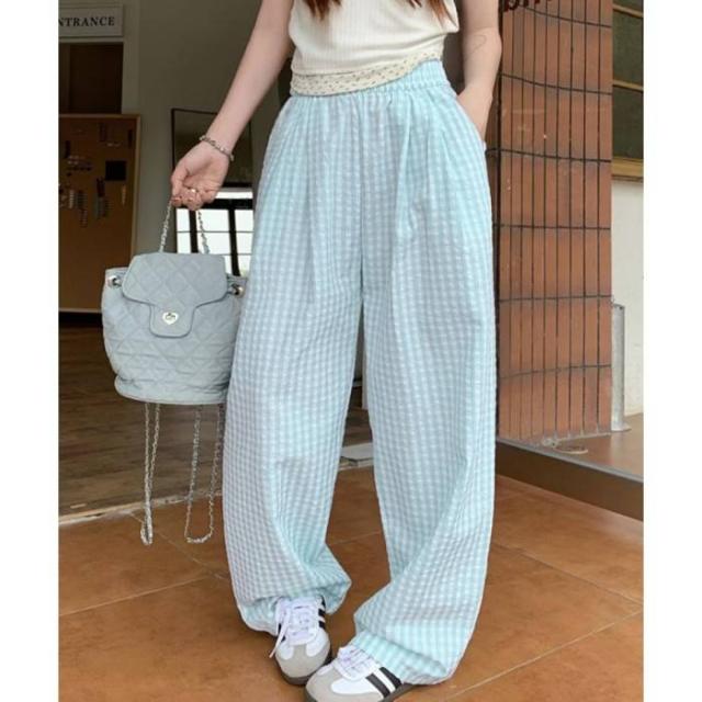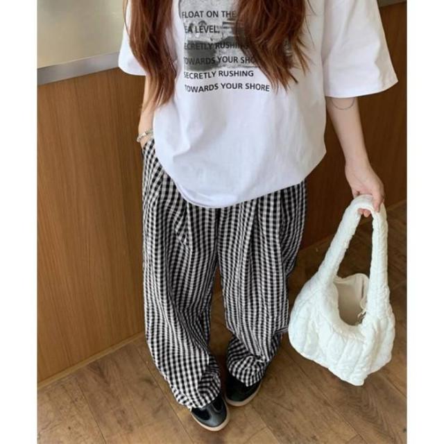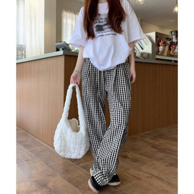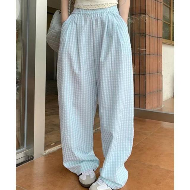 チェック柄ワイドパンツ ハイウエスト薄手