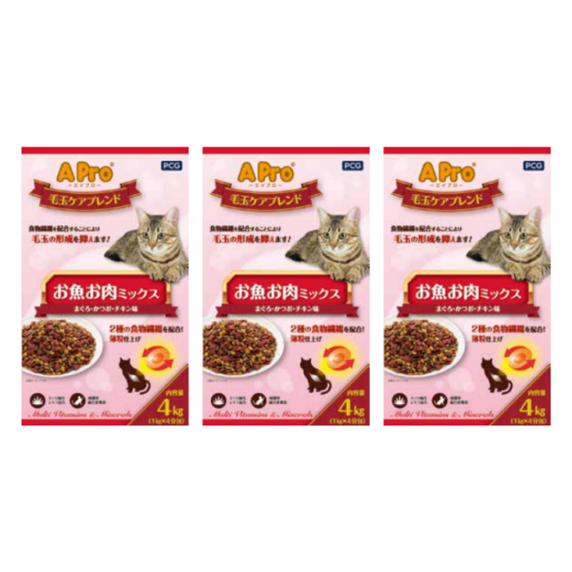 【送料無料】A Pro エイプロ 毛玉ケアブレンド お魚お肉ミックス 4kg×3袋セット 総合栄養食 キャットフード 成猫 ドライフード 健康維持 薄粒 大容量 お徳用 まとめ売り 多頭飼い