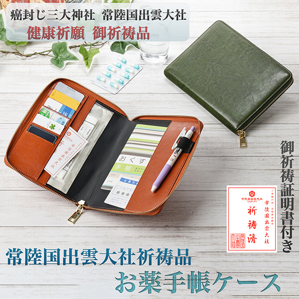 常陸国出雲大社祈祷品 お薬手帳ケース ‐ OM252 OM253 診察券 保険証 通院 革 レザー 通帳ケース シンプル レディース メンズ 無地 ペンホルダー ラウンドファスナー グリーン キャメル 癌封じ