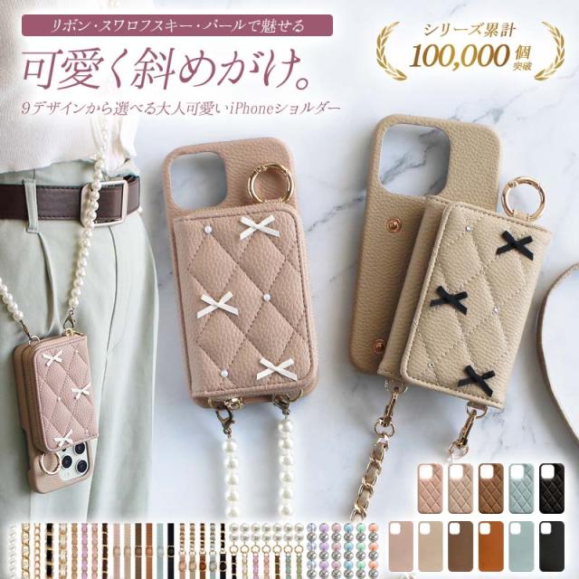 スマホケース iPhoneケース【レザーorキルティング×カード入れor小銭入れ×リボン×ロングストラップ】メール便送料無料 受注生産