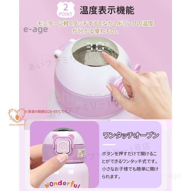 商品名:子供用水筒容量:600ml素材内びん?口がね?胴部:ステンレス鋼フタ:食品級PPパッキン?ストロー: 食品級シリカゲル生産国:中国「温度表示機能」モニターに軽くタッチするとなかのドリンクの温度が分かる優れもの。 飲む前に温度の確認ができます。「ストロー飲みとコップ飲みの2WAY」頭の部分を付け替えることで変更できる、幼稚園生から小学校低学年位まで使える保温保冷水筒です。広口デザインなので、氷も入れやすいです。ストローは取り外し可能し、洗いやすいです。「ワンタッチオープン」ワンタッチオープンで小さな子供でも簡単に開けられます。「ストラップ付きのバッグ」調整できるトラップで身長に合わせて長さも変更できます。カバーには手をひっかけられる部分がある、使えるのは便利です。「ステンレス鋼&真空断熱」真空断熱ステンレス魔法びん構造で保温(12時間)保冷(24時間)に優れており、適な温度を長時間保つことができます。夏になると、冷たさが持続していて、保冷が出来たマグの方が腐らず、冷たくて美味しいからか子供さんの飲みっぷりもいいです。