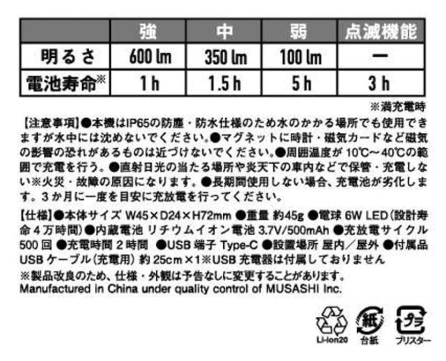 | ・ 電球:6W LED(設計寿命4万時間) ・ 内蔵電池:リチウムイオン電池 3.7V/500mAh ・ 充放電サイクル(約):500回 ・ 充電時間(約):2時間 ・ 明るさ/電池寿命:〈強〉600lm/1h 〈中〉350lm/1.5h 〈弱〉100lm/5h 〈点滅機能〉3h ・ USB端子:Type-C |