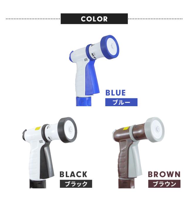 | ワンタッチ操作!握って通水、もう一度握って止水が出来る便利なコンパクトノズル。 小型・軽量化して女性にも使いやすくなりました。 蛇口から離れた場所での散水を考慮し、手元で水量を調節できる便利な「水量調節コック」がついています。 通水・止水の操作もレバーが簡単に行えます。 ◇水量調節コック 手元で散水量を調整できるコック付き。 ◇水流切り換え 5つの水流が選べます。 草花や苗・観葉植物等の水やりに最適なやさしい霧の水流もついています。 (霧、拡散、ストレート、ジョーロ、シャワー) ◇レバー レバーを引くと通水状態が保たれ、もう一度レバーを引くと元の位置に戻り止水状態になります。 ◇ロータリーコネクター ノズルとホースの取り付け・取り外しがワンタッチでできます。 360度回転しホースのねじれを防ぎます。 |