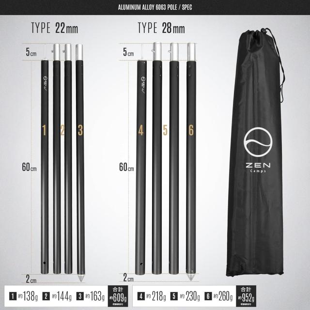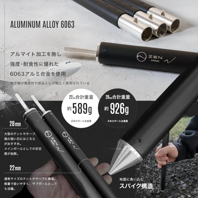 ZEN Camps タープポール テントポール 2本セット 直径28mm 4分割 アルミ 軽量 地面に刺さる タープ テント ポール キャンプ