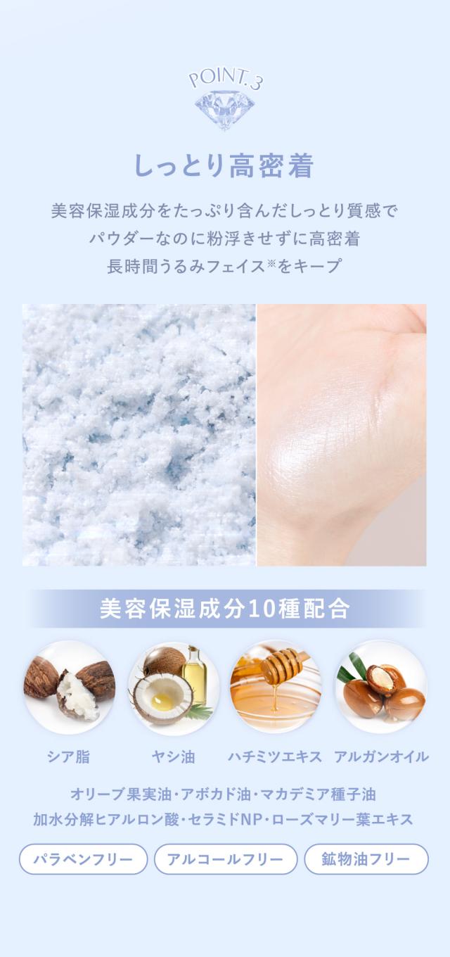 ジメチコン、マイカ、ステアリン酸Mg、ポリメチルシルセスキオキサン、セラミドNP、シア脂、加水分解ヒアルロン酸、ハチミツエキス、ローズマリー葉エキス、アボカド油、アルガニアスピノサ核油、オリーブ果実油、マカデミア種子油、ヤシ油、アマニ油、ヒマワリ種子油、ダイズ種子エキス、水、グリコーゲン、セリン、エチルヘキシルグリセリン、PCA-Na、フェノキシエタノール、合成フルオロフロゴパイト、酸化チタン、酸化スズ、コンジョウ、黄4