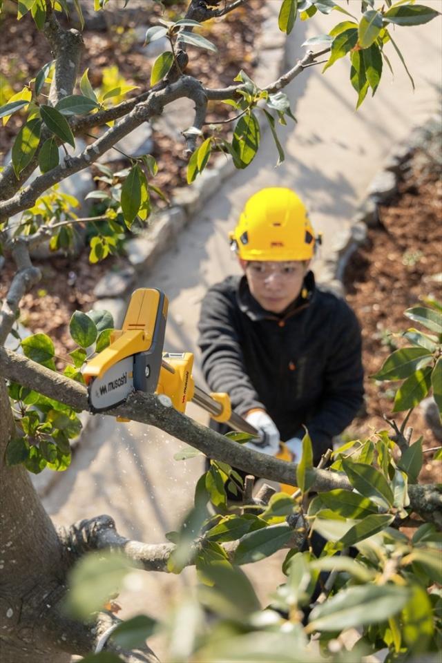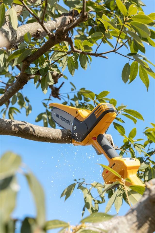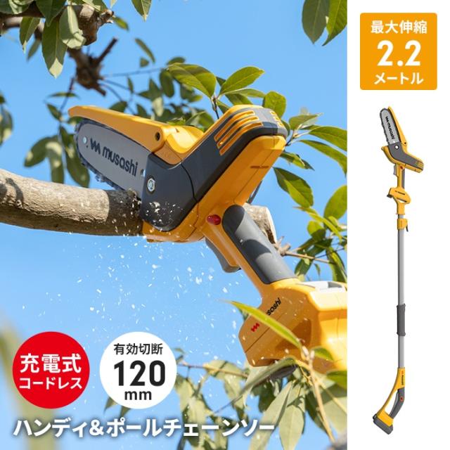 | 低木から高木まで太枝が切れる、ポール付き小型チェーンソー。 高い木にはポールチェーンソー、手元の太枝にはハンディチェーンソー。 伸縮自在で高い木の太枝も楽に切ることができます。 最大12cmまで切断できるパワフル切断。 切断時に固定しやすい滑り止めスパイク。 もしものキックバック時も安心、安全ガード。 1回の充電で180本切断可能です。(※満充電時、3.8cm生木の場合) |