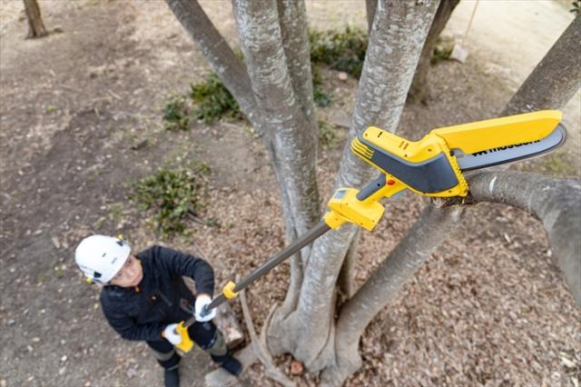低木から高木まで太枝が切れる、ポール付き小型チェーンソー。