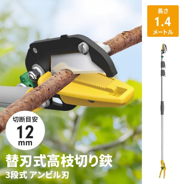 キーワード: 高枝切りバサミ 1.4〜3.1m 3段式 18段伸縮 高枝切り はさみ キャッチ機能 アンビル刃 薄刃 刃交換可 枝切り 果実採り 高枝切りバサミ キャッチ機能 切ってつかめる 生木裁断 最大Φ1.2cm 薄刃 0.6mm 軽く切れる 包丁とまな板の原理でラクラクカット 疲労軽減グリップ コンパクト収納