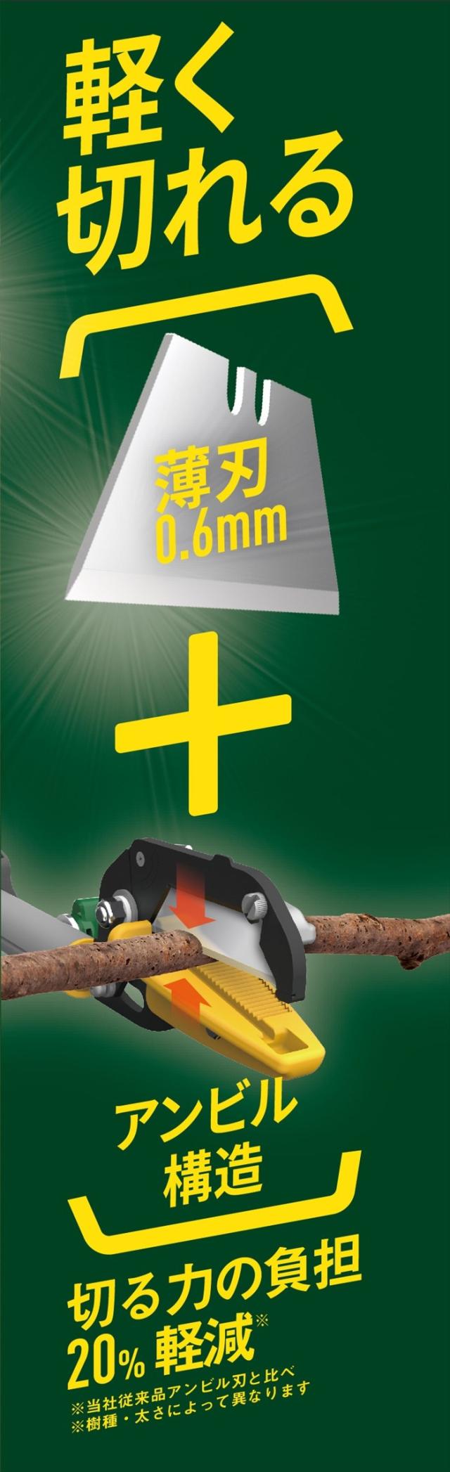 | 刃を替えるたびに新品の切れ味。 伸縮3段式高枝切り鋏です。 究極の薄刃を実現。 薄刃0.06cmとアンビル構造で、切る力の負担が20%軽減。 切ってつかめる可動式キャッチ機能付きで、剪定や収穫にオススメです。 コンパクトに収納できて便利。 刃を簡単に交換できるのもポイントです。 |