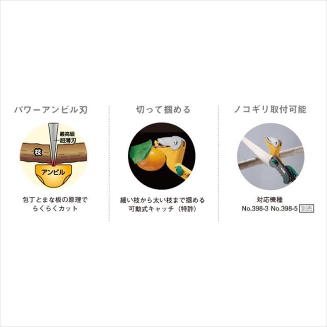 | ・ 刃:アンビル刃(本刃加工:フッ素樹脂 ) ・ 伸縮機能:1.75m~3.05m(14段階式) ・ 新構造ハンドル ・ 最大切断径:約Φ2cm(生木)(※木の種類や季節により異なります。) ・ 可動式キャッチ機能付き ・ 疲労軽減:スライド型補助グリップ ・ 別売のノコギリ刃取付可能(No.398-1、No.398-3、No.398-5) ・ 2段伸縮 |