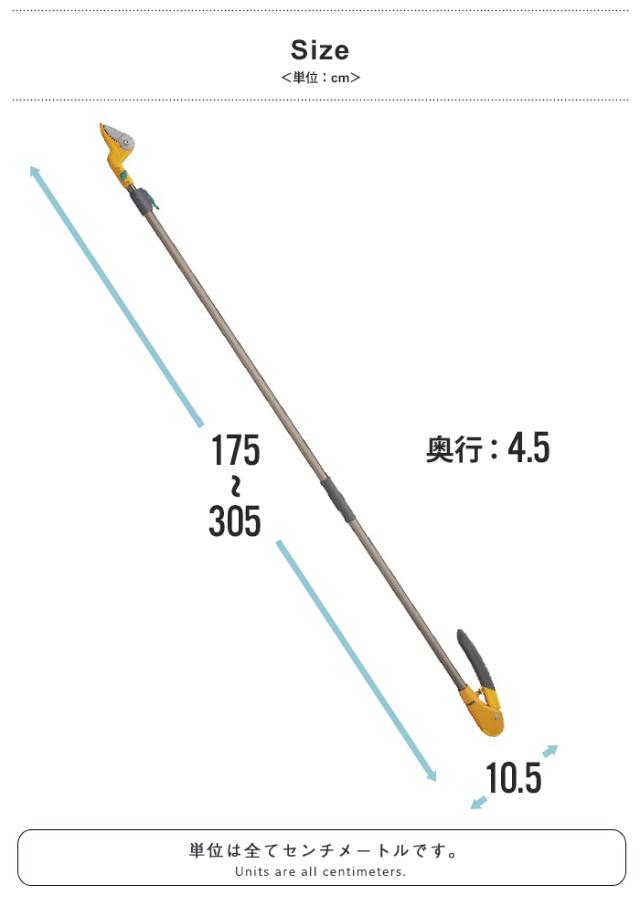 キーワード: 高枝切りバサミ 1.75〜3.05m 2段式 14段伸縮 高枝切 はさみ キャッチ機能 プッシュカット 押して切る アンビル刃 高枝切りバサミ 新構造ハンドル プッシュカット 腕の力でラクラクカット 楽に切れる キャッチ機能 切ってつかめる 生木裁断 最大Φ2cm 疲労軽減グリップ 便利
