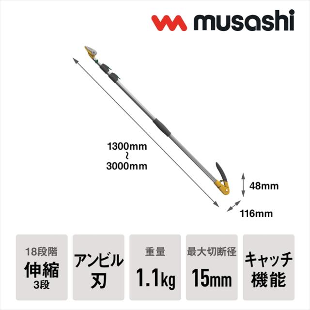 高枝切りバサミ 1.3〜3m 3段式 18段伸縮 高枝切り はさみ キャッチ機能 プッシュカット 押して切る アンビル刃