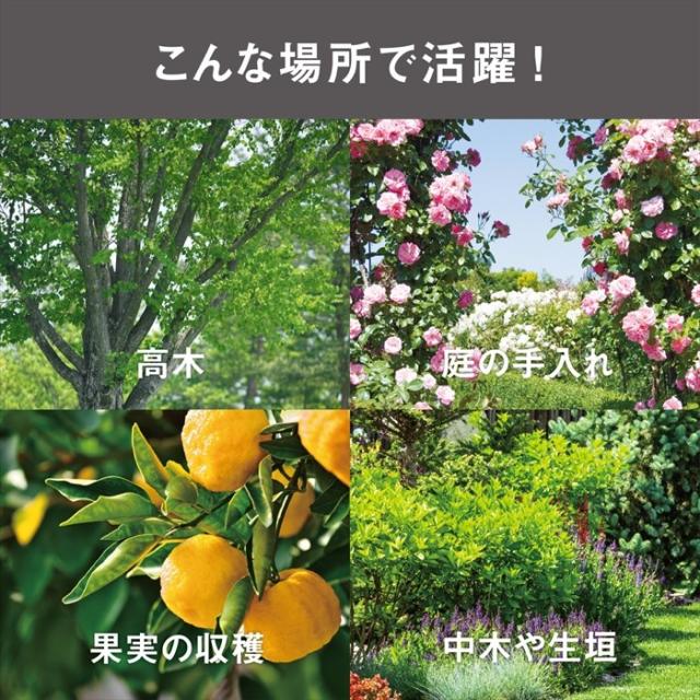 | 軽い力で楽々切れる! 従来の手で握るハンドルは枝を切るのに強い力が必要でした。 当製品は世界初の新構造ハンドル。 握るハンドルに比べ切る力は50%軽減。 腕の力で切るので軽い力で楽々切れます。 シリーズ最軽量設計で女性や年配の方でも楽に軽く作業していただけます。 ワンタッチで伸縮可能。 1.3〜3.0mの18段階伸縮ができます。 車のトランクや物置に収納しやすい3段式のコンパクトタイプ。 切ってつかめるキャッチ機能も搭載。 ノコギリ(別売)も取り付け可能。 |