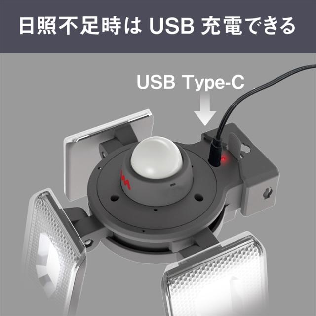 センサーライト ソーラーパネル付 ソーラー USB 充電式 ソーラーセンサーライト LED 7.5W 3灯 IP44 防雨 防犯