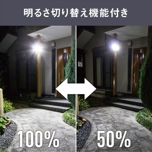 | スライド式で自由な配光。 太陽光+USB充電ができる!安定した点灯を維持できるソーラー式センサーライトです。 ソーラータイプライト部がスライド式で照射方向が自由に調節できます。 真下を照らしたり、ライトを片側に寄せて照らすことも自由自在。 日照不足でソーラー発電が不足したときはUSBから充電できます。 【自動省エネモード】 バッテリー残量が20%を切るとライトの明るさを自動で下げることで充電不足による不点灯を防止します。 【点灯モード】 100%の明るさのパワーモードと50%の明るさのエコモードが選択切替できます。 ライトが点滅するフラッシュ発光モードも搭載しています。 パワーモードは1800ルーメンの明るさで340回点灯し、エコモードは900ルーメンの明るさで680回点灯します。 ※満充電時での点灯回数目安です。 【別売パーツでどこでも取付け】 柱・ポール・鉄面・サッシ・フェンスなど別売パーツを使うことであらゆる場所へ設置が可能です。 ・SP- 5 クランプセット ・SP- 7 ステンレスバンド ・SP-10 強力マグネットベース ・SP-13 サッシ・薄板用ベース ・SP-14 フェンス挟み込みベース ・SP-15 クリップベース |