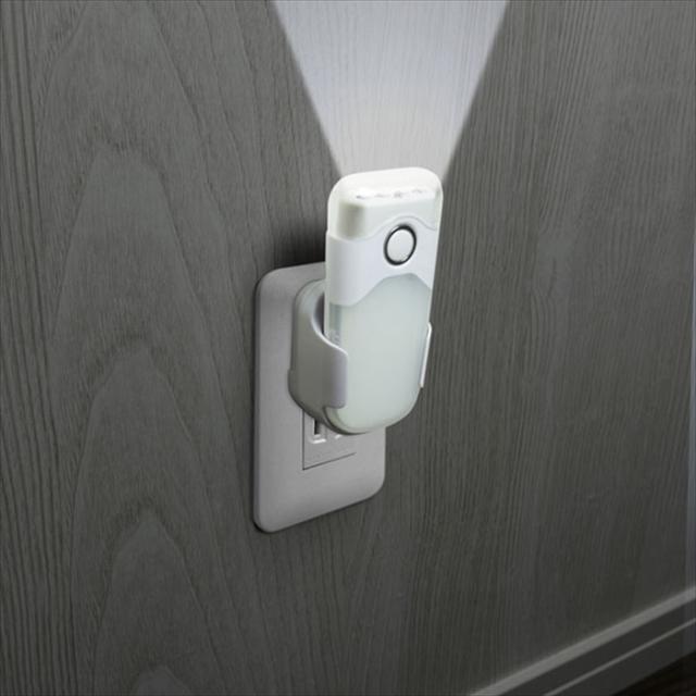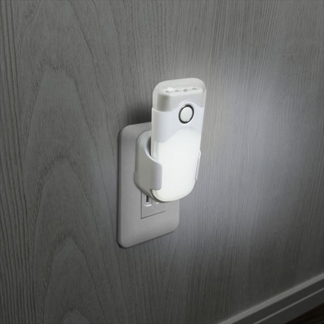 暗くなると自動でほんのり点灯するナイトライト、手に取るとパッと点灯する懐中電灯、停電時には自動点灯する非常灯となります。