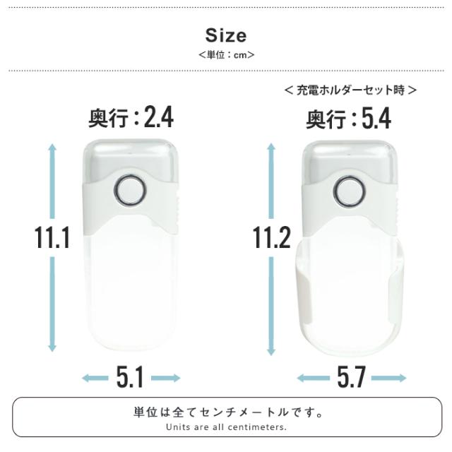 | [ライト部のみ]幅5.1×奥行2.4×高さ11.1cm [充電ホルダーセット時]幅5.7×奥行5.4×高さ11.2cm |