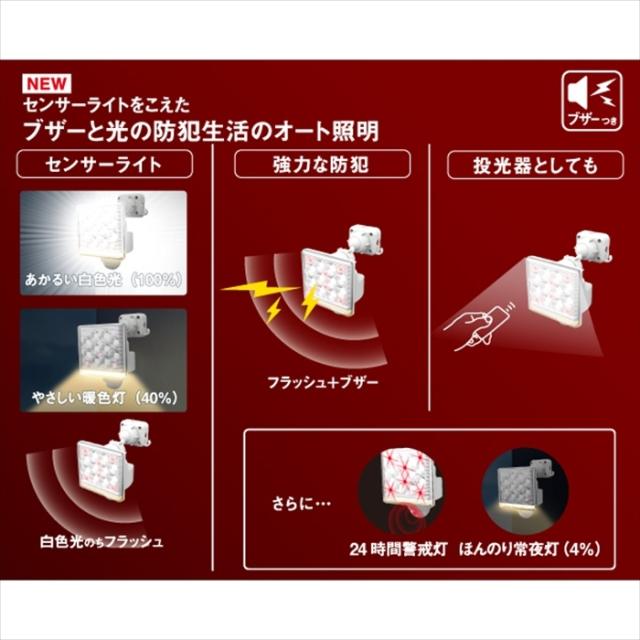 | 高機能+防犯対策向きのコンセント式センサーライト。 センサーライトを超えたブザーと光の防犯生活のオート照明。 フリーアーム式で圧倒的な自由度を実現します。 |