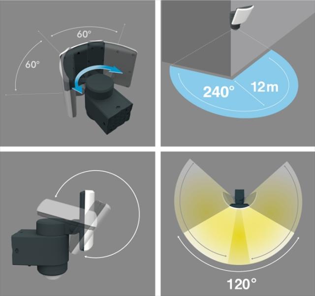 | 人の動きに合わせて光が自動追尾。 可動・探知・照射範囲。 常夜灯機能。 センサー探知方向に自動でライトが動くセンサーライトです。 人の動きに合わせて光が自動追尾するので、高い利便性・防犯効果を実現しました。 シリーズ上位の2000ルーメンの明るいライトを搭載しています。 ライトの向きは正面を基準として探知した方向に左右60°可動します。 ライト上下の向きは手動で調整となります。 センサー探知範囲は240°の広範囲をカバー。 周囲が暗くなると自動点灯する常夜灯モードを搭載。 常夜灯の明るさは3段階に調節できます(弱100Lm、中200Lm、強300Lm)。 センサー感知で100%の明るさ(2000Lm)で点灯します。 |