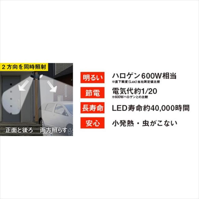 | ・ 電源/電圧:AC100V電源(コード長:3m)/ 50/60Hz ・ 消費電力:・点灯時:30W/常夜灯:3W/・待機時:1.0W以下 ・ 電球:電気種類/14W×2(高輝度白色LED) 全光束/約3000ルーメン<(点灯時) 300ルーメン(常夜灯) LED設計寿命(※1)/約40,000時間 ・ センサー機能:探知角度/水平約140° 探知距離(最大)/約10m ・ 点灯時間:約5秒〜約5分 ・ 昼夜切り替え機能:あり 〈昼〉周囲が明るくても暗くても点灯/〈夜〉周囲が暗い時のみ点灯/〈常夜灯〉周囲が暗くなると常夜灯(明るさ10%)が点灯し周囲が明るくなると消灯 |